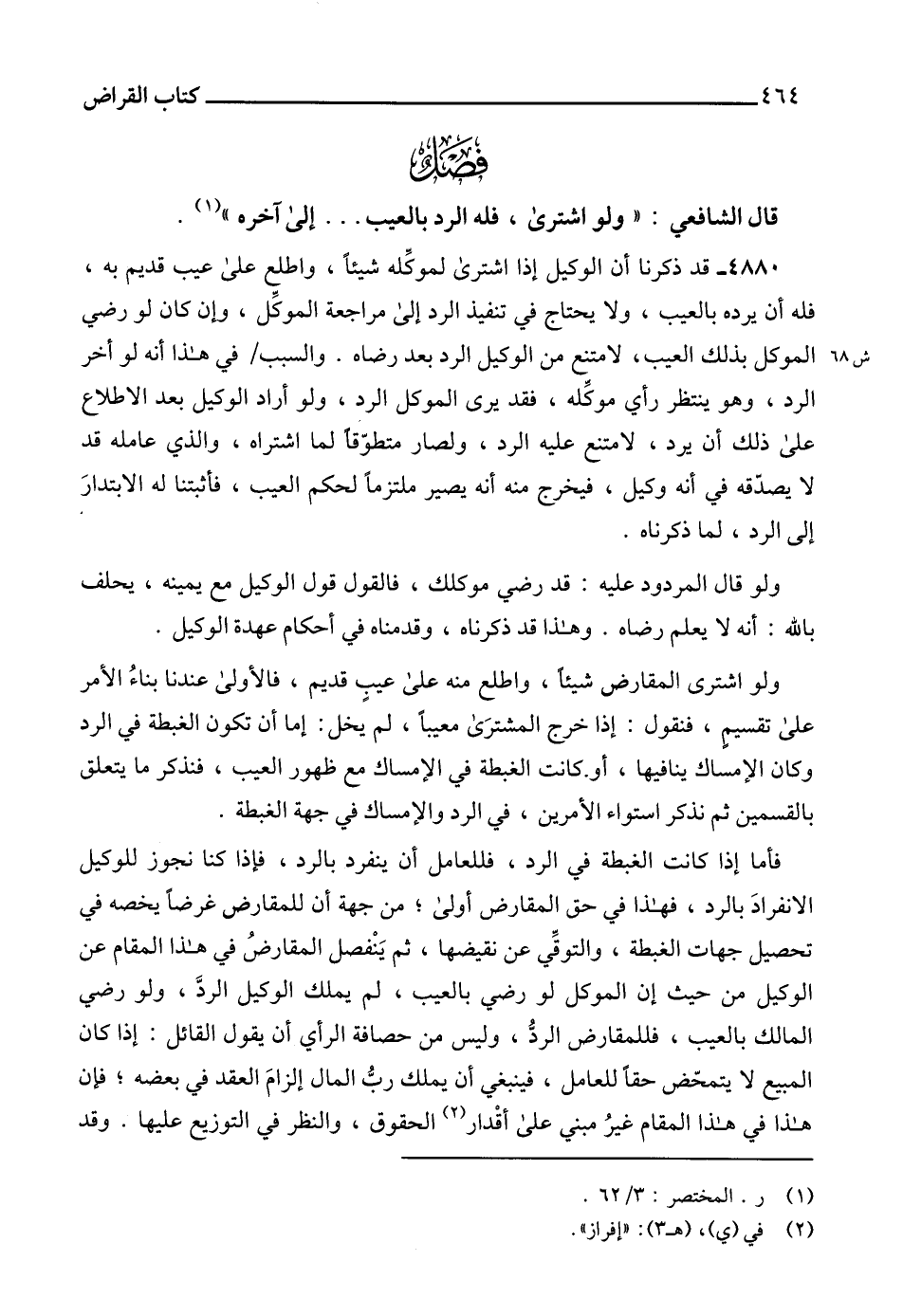 فأما إذا كانت الغبطة في الرد، فللعامل أن ينفرد بالرد، فإذا كنا نجوز للوكيل الانفرادَ بالرد، فهذا في حق المقارض أولى؛ من جهة أن للمقارض غرضاً يخصه في تحصيل جهات الغبطة، والتوقِّي عن نقيضها، ثم يَنْفصل المقارضُ في هذا المقام عن الوكيل من حيث إن الموكل لو رضي بالعيب، لم يملك الوكيل الردَّ، ولو رضي المالك بالعيب، فللمقارض الردُّ، وليس من حصافة الرأي أن يقول القائل: إذا كان المبيع لا يتمحّض حقاً للعامل، فينبغي أن يملك ربُّ المال إلزامَ العقد في بعضه؛ فإن هذا في هذا المقام غيرُ مبني على أقْدار (2) الحقوق، والنظر في التوزيع عليها. وقد