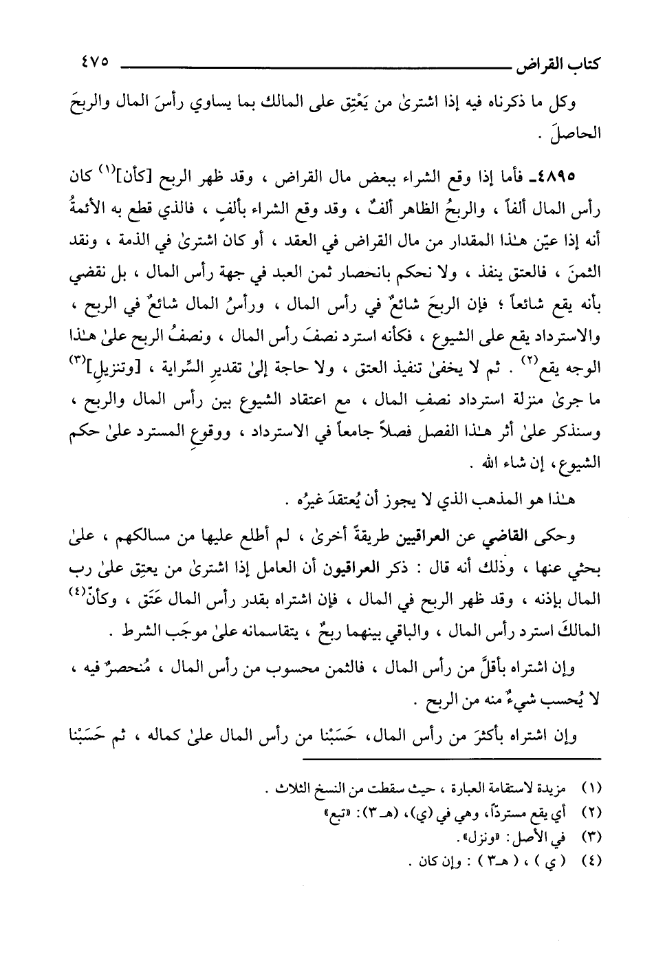 4895 - فأما إذا وقع الشراء ببعض مال القراض، وقد ظهر الربح [كأن] (1) كان رأس المال ألفاً، والربحُ الظاهر ألفٌ، وقد وقع الشراء بألفٍ، فالذي قطع به الأئمةُ أنه إذا عيّن هذا المقدار من مال القراض في العقد، أو كان اشترى في الذمة، ونقد الثمنَ، فالعتق ينفذ، ولا نحكم بانحصار ثمن العبد في جهة رأس المال، بل نقضي بأنه يقع شائعاً؛ فإن الربحَ شائعٌ في رأس المال، ورأسُ المال شائعٌ في الربح، والاسترداد يقع على الشيوع، فكأنه استرد نصفَ رأس المال، ونصفُ الربح على هذا الوجه يقع (2). ثم لا يخفى تنفيذ العتق، ولا حاجة إلى تقديرِ السِّراية، [وتنزيلِ] (3) ما جرى منزلة استرداد نصفِ المال، مع اعتقاد الشيوع بين رأس المال والربح، وسنذكر على أثر هذا الفصل فصلاً جامعاً في الاسترداد، ووقوعِ المسترد على حكم الشيوع، إن شاء الله.