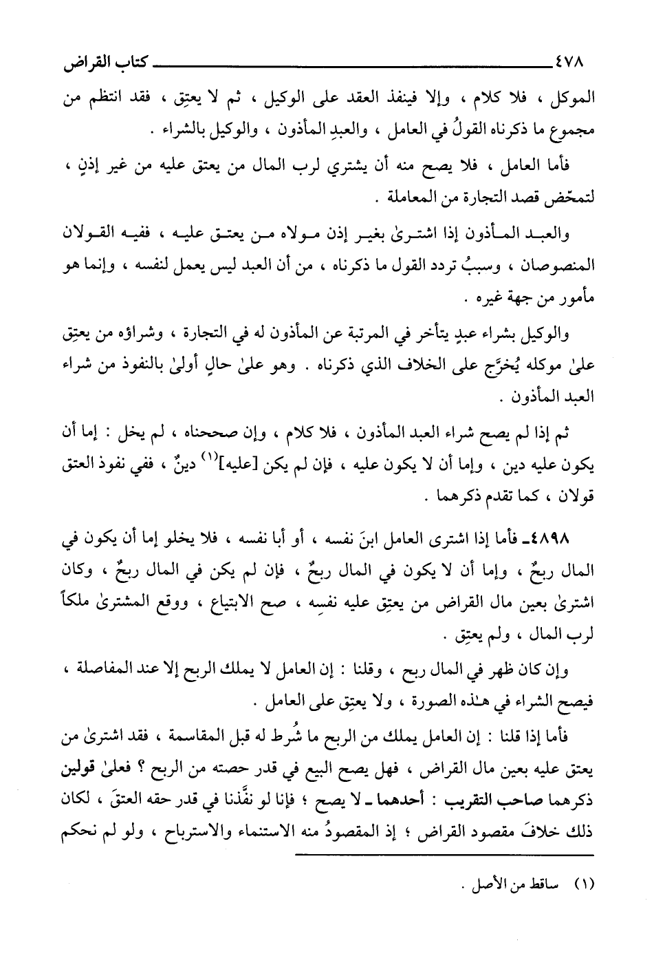 4898 - فأما إذا اشترى العامل ابنَ نفسه، أو أبا نفسه، فلا يخلو إما أن يكون في المال ربحٌ، وإما أن لا يكون في المال ربحٌ، فإن لم يكن في المال ربحٌ، وكان اشترى بعين مال القراض من يعتِق عليه نفسِه، صح الابتياع، ووقع المشترى ملكاً لرب المال، ولم يعتِق.