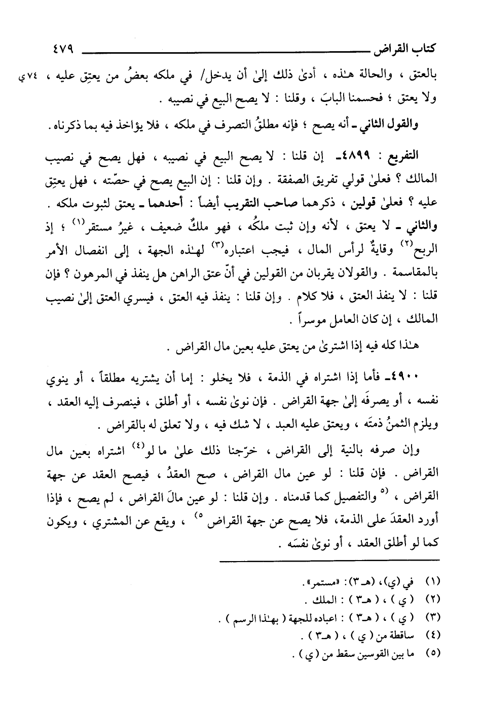4900 - فأما إذا اشتراه في الذمة، فلا يخلو: إما أن يشتريه مطلقاًً، أو ينوي نفسه، أو يصرفَه إلى جهة القراض. فإن نوى نفسه، أو أطلق، فينصرف إليه العقد، ويلزم الثمنُ ذمتَه، ويعتق عليه العبد، لا شك فيه، ولا تعلق له بالقراض.