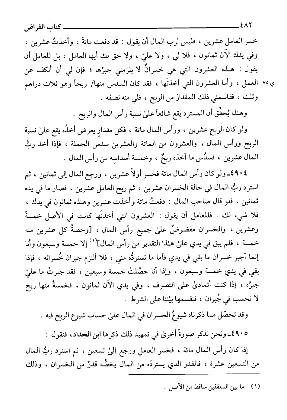4905 - ونحن نذكر صورةً أخرى في تمهيد ذلك ذكرها ابن الحداد، فنقول: إذا كان رأس المال مائة، فخسر العامل ورجع إلى تسعين، ثم استرد ربُّ المال من التسعين عشرة، فالقدر الذي يستردّه من المال يخصُّه قدرٌ من الخسران، وذلك