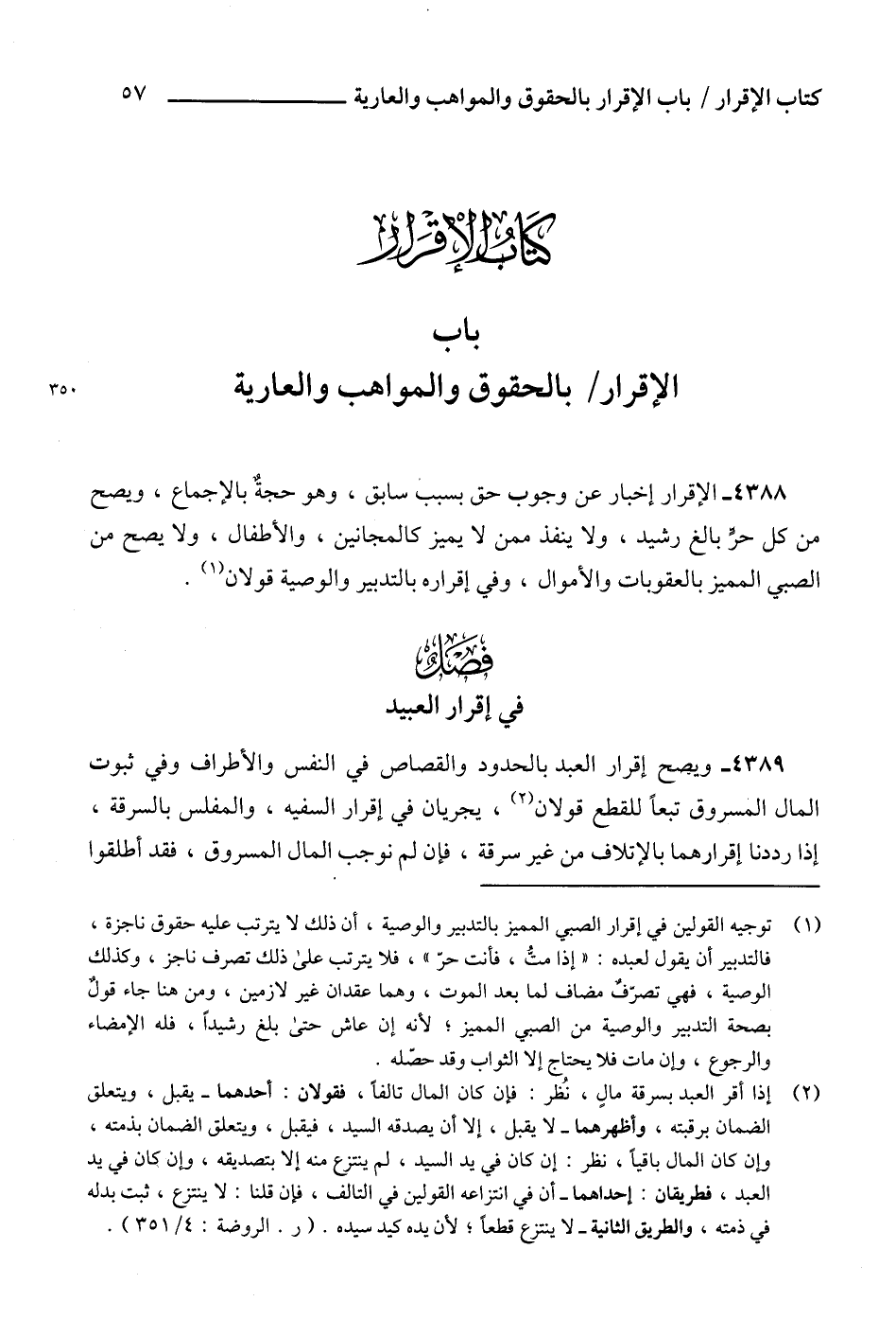 4388 - الإقرار إخبار عن وجوب حق بسبب سابق، وهو حجةٌ بالإجماع، ويصح من كل حرٍّ بالغ رشيد، ولا ينفذ ممن لا يميز كالمجانين، والأطفال، ولا يصح من الصبي المميز بالعقوبات والأموال، وفي إقراره بالتدبير والوصية قولان (1).