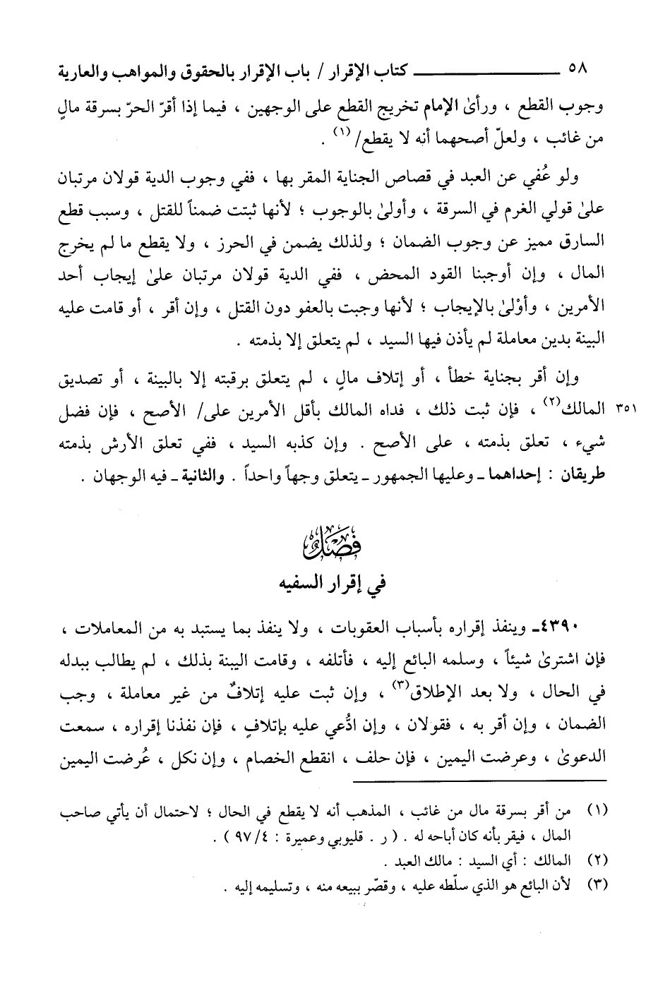 4390 - وينفذ إقراره بأسباب العقوبات، ولا ينفذ بما يستبد به من المعاملات، فإن اشترى شيئاًً، وسلمه البائع إليه، فأتلفه، وقامت اليبنة بذلك، لم يطالب ببدله في الحال، ولا بعد الإطلاق (3)، وإن ثبت عليه إتلافٌ من غير معاملة، وجب الضمان، وإن أقر به، فقولان، وإن ادُّعي عليه بإتلافٍ، فإن نفذنا إقراره، سمعت الدعوى، وعرضت اليمين، فإن حلف، انقطع الخصام، وإن نكل، عُرضت اليمين