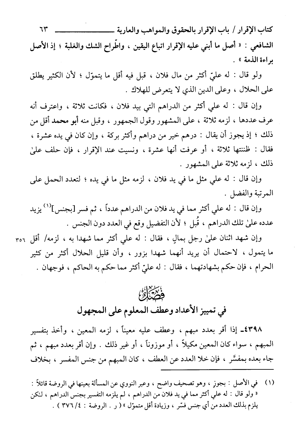 4398 - إذا أقر بعدد مبهم، وعطف عليه معيناً، لزمه المعين، وأخذ بتفسير المبهم، سواء كان المعين مكيلاً، أو موزوناً، أو غير ذلك. وإن أقر بعدد مبهم، ثم جاء بعده بمفسَّر، فإن خلا العدد عن العطف، كان المبهم من جنس المفسر، بخلاف