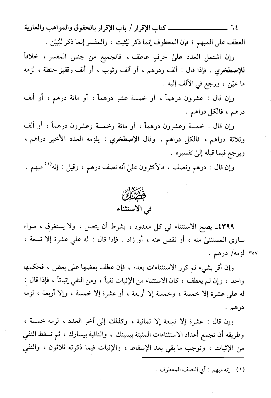 4399 - يصح الاستثناء في كل معدود، بشرط أن يتصل، ولا يستغرق، سواء ساوى المستثنى منه، أو نقص عنه، أو زاد. فإذا قال: له علي عشرة إلا تسعة، لزمه درهم.