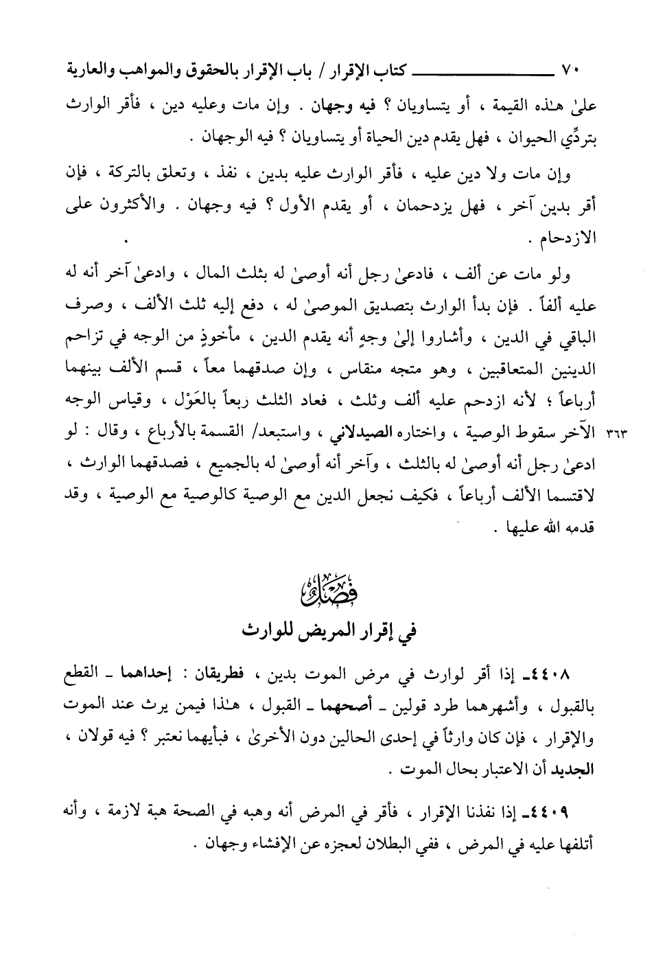 4408 - إذا أقر لوارث في مرض الموت بدين، فطريقان: إحداهما -القطع بالقبول، وأشهرهما طرد قولين- أصحهما - القبول، هذا فيمن يرث عند الموت والإقرار، فإن كان وارثاً في إحدى الحالين دون الأخرى، فبأيهما نعتبر؟ فيه قولان، الجديد أن الاعتبار بحال الموت.