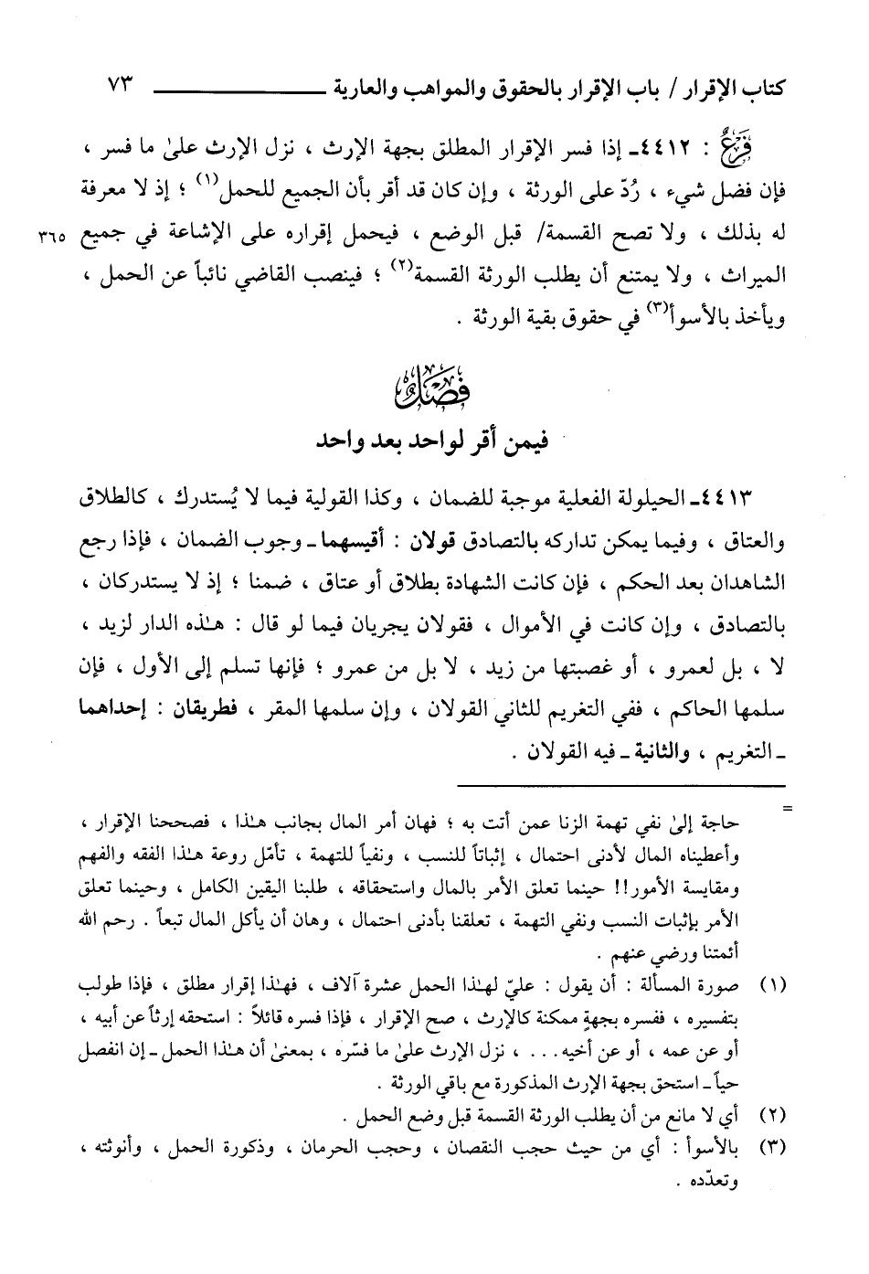 (1) صورة المسألة: أن يقول: عليّ لهذا الحمل عشرة آلاف، فهذا إقرار مطلق، فإذا طولب بتفسيره، ففسره بجهةٍ ممكنة كالإرث، صح الإقرار، فإذا فسره قائلاً: استحقه إرثاً عن أبيه، أو عن عمه، أو عن أخيه ... ، نزل الإرث على ما فسّره، بمعنى أن هذا الحمل -إن انفصل حياً- استحق بجهة الإرث المذكورة مع باقي الورثة.