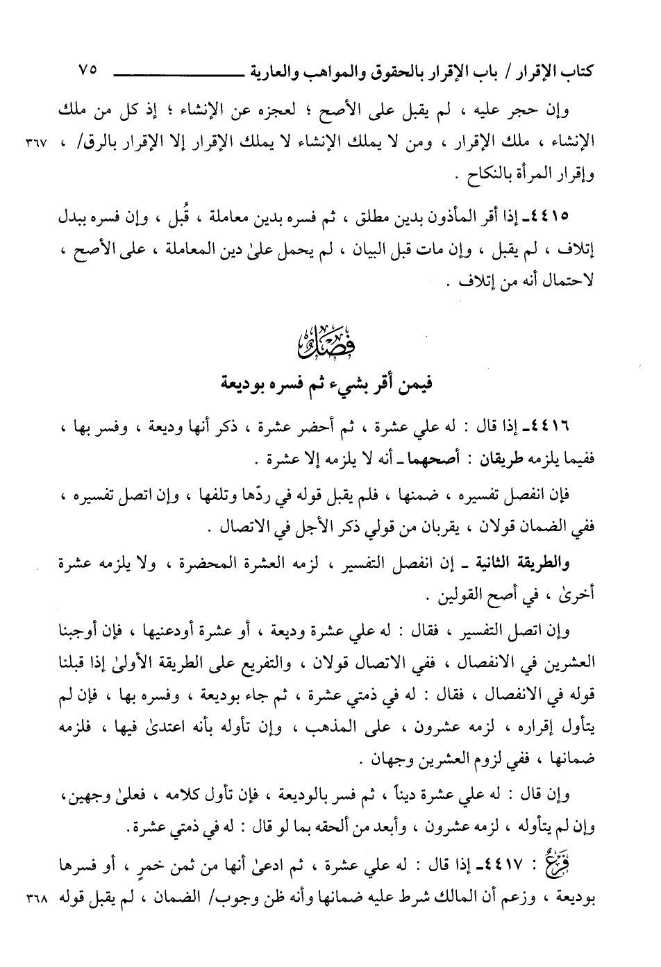 4417 - إذا قال: له علي عشرة، ثم ادعى أنها من ثمن خمرٍ، أو فسرها بوديعة، وزعم أن المالك شرط عليه ضمانها وأنه ظن وجوب الضمان، لم يقبل قوله