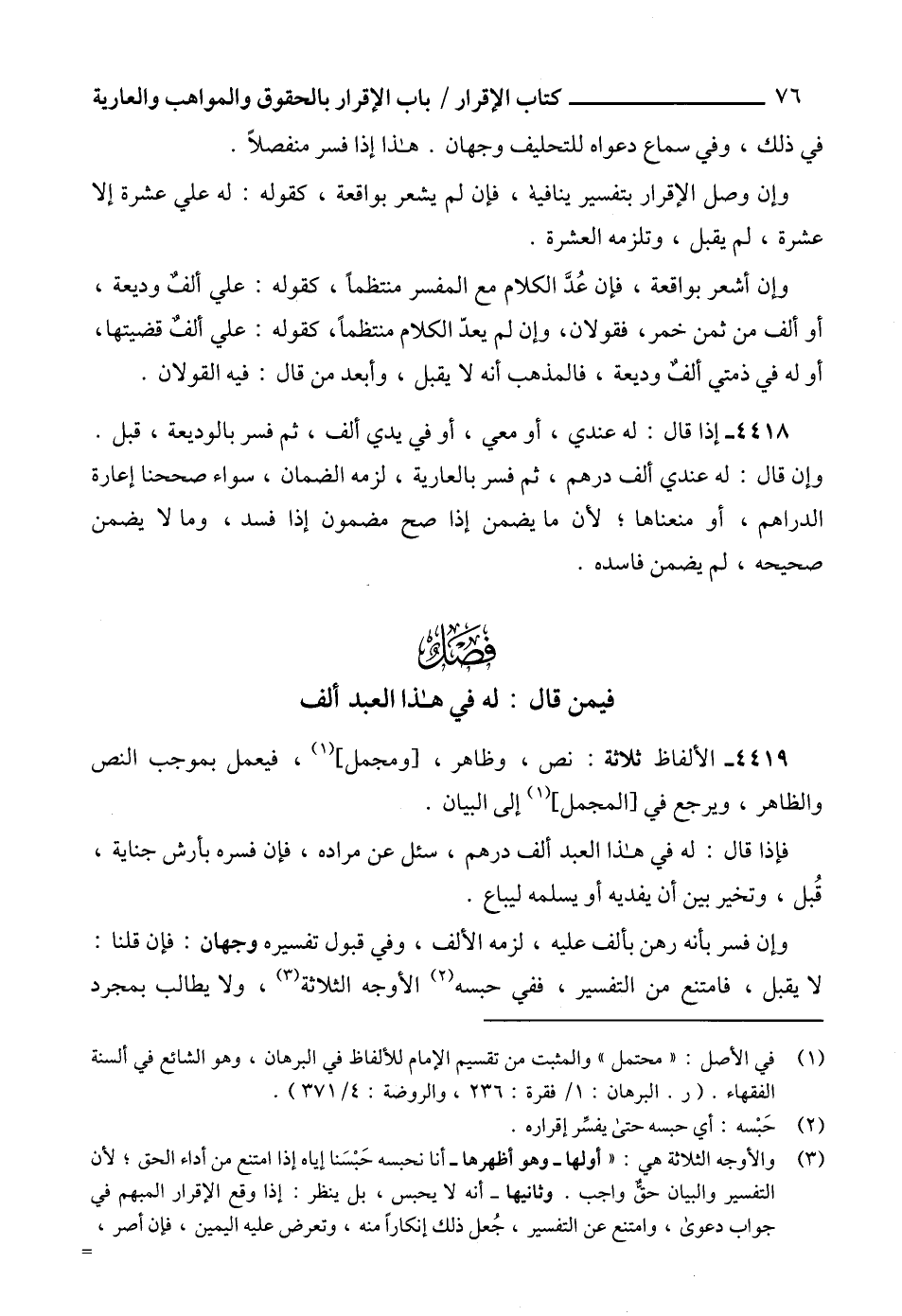 (3) والأوجه الثلاثة هي: "أولها -وهو أظهرها- أنا نحبسه حَبْسَنا إياه إذا امتنع من أداء الحق؛ لأن التفسير والبيان حقٌّ واجب. وثانيها - أنه لا يحبس، بل ينظر: إذا وقع الإقرار المبهم في جواب دعوى، وامتنع عن التفسير، جُعل ذلك إنكاراً منه، وتعرض عليه اليمين، فإن أصر، =