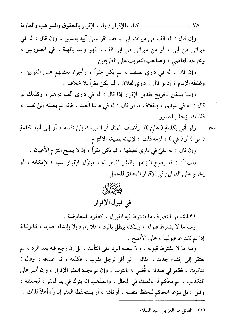 ومنه ما لا يشترط قبوله، ولا يُبطله الرد على التأبيد، بل إن رجع فيه بعد الرد، لم يفتقر إلى إنشاء جديد، مثاله: لو أقر لرجل بثوب، فكذبه، ثم صدقه، وقال: تذكرت، فظهر لي صدقه، قُضي له بالثوب، وإن لم يجدد المقر الإقرار، وإن أصر على التكذيب، لم يحكم له بالملك في الحال، والمذهب أنه يترك في يد المقر، ليحفظه، وقيل: بل ينزعه الحاكم ليحفظه بنفسه، أو نائبه، أو يستحفظه المقر إن رآه أهلاً لذلك.