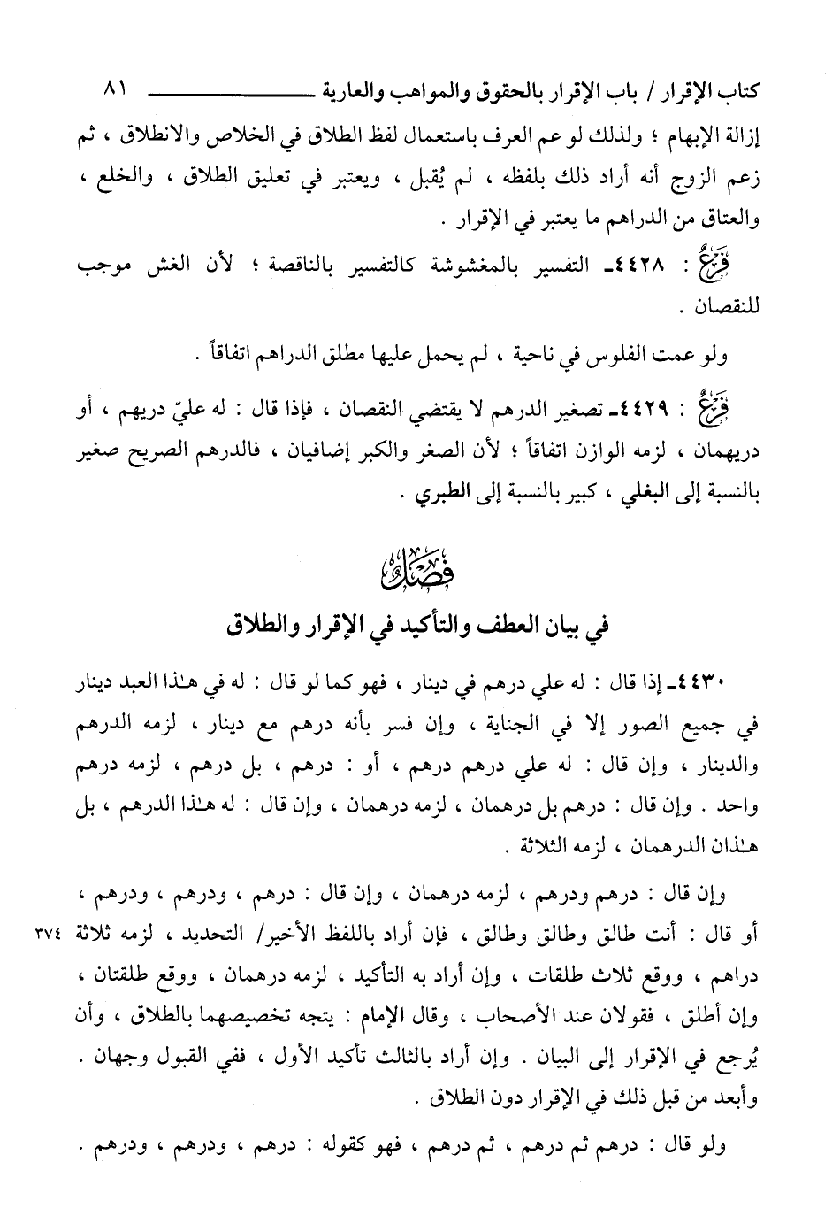 في بيان العطف والتأكيد في الإقرار والطلاق