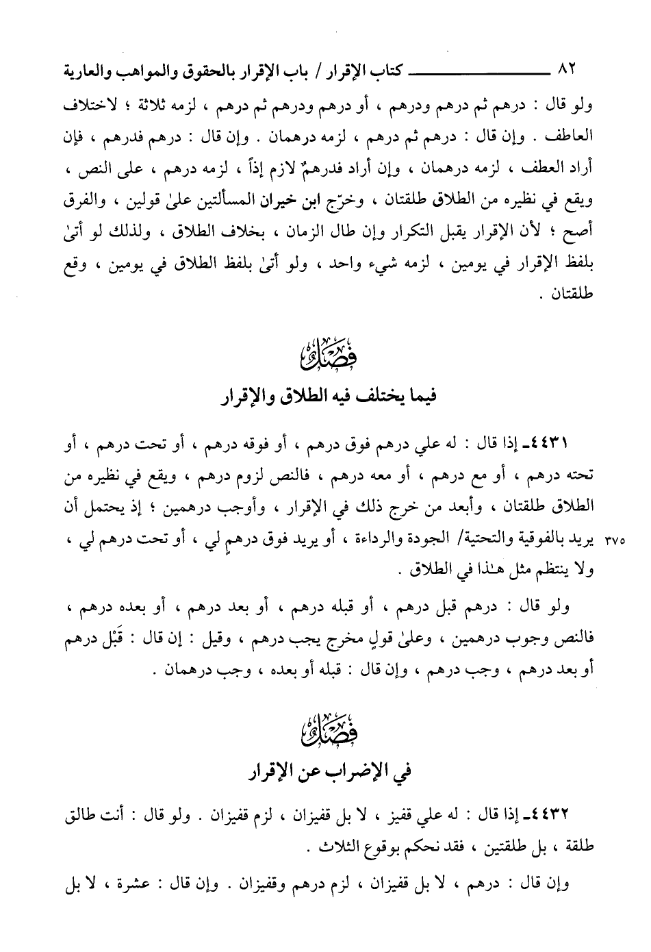 4431 - إذا قال: له علي درهم فوق درهم، أو فوقه درهم، أو تحت درهم، أو تحته درهم، أو مع درهم، أو معه درهم، فالنص لزوم درهم، ويقع في نظيره من الطلاق طلقتان، وأبعد من خرج ذلك في الإقرار، وأوجب درهمين؛ إذ يحتمل أن يريد بالفوقية والتحتية الجودة والرداءة، أو يريد فوق درهمٍ لي، أو تحت درهم لي، ولا ينتظم مثل هذا في الطلاق.