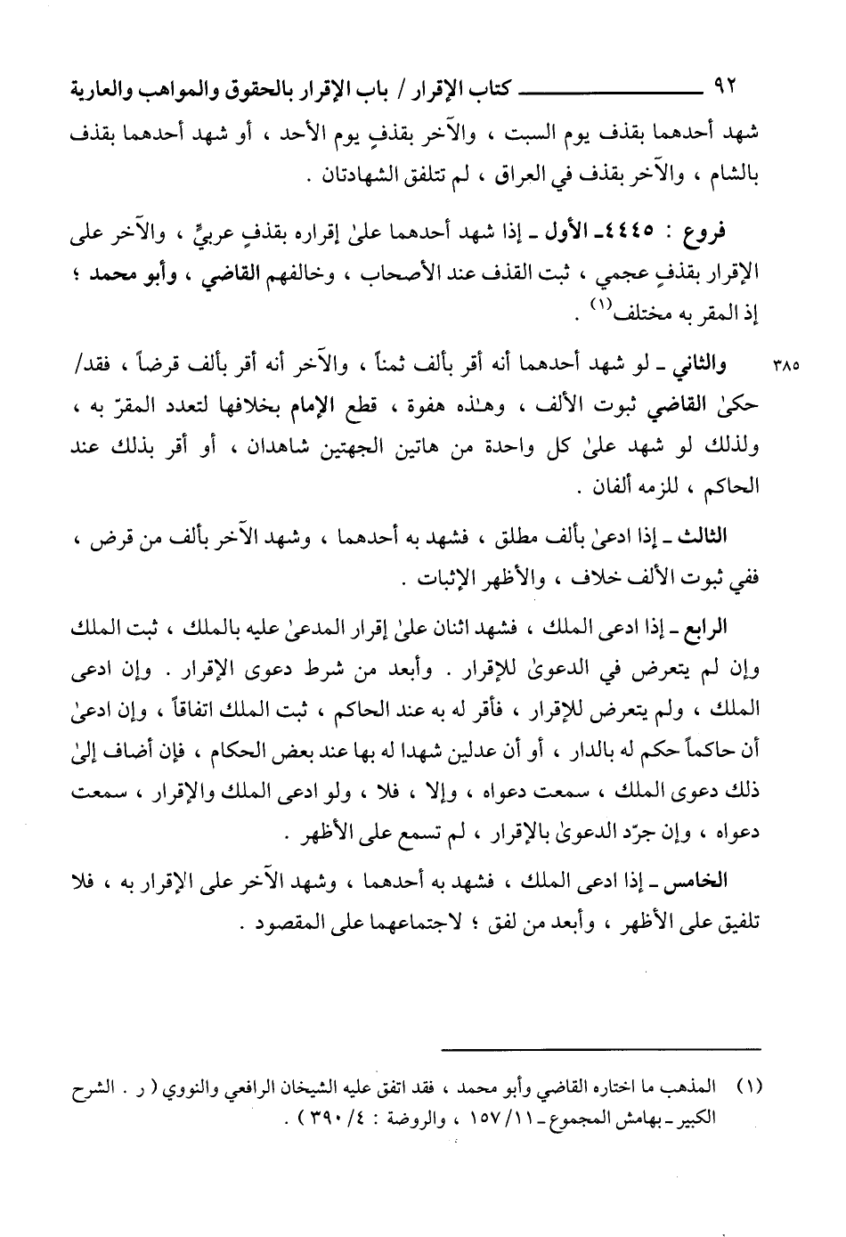 4445 - الأول - إذا شهد أحدهما على إقراره بقذفٍ عربيٍّ، والآخر على الإقرار بقذفٍ عجمي، ثبت القذف عند الأصحاب، وخالفهم القاضي، وأبو محمد؛ إذ المقر به مختلف (1).