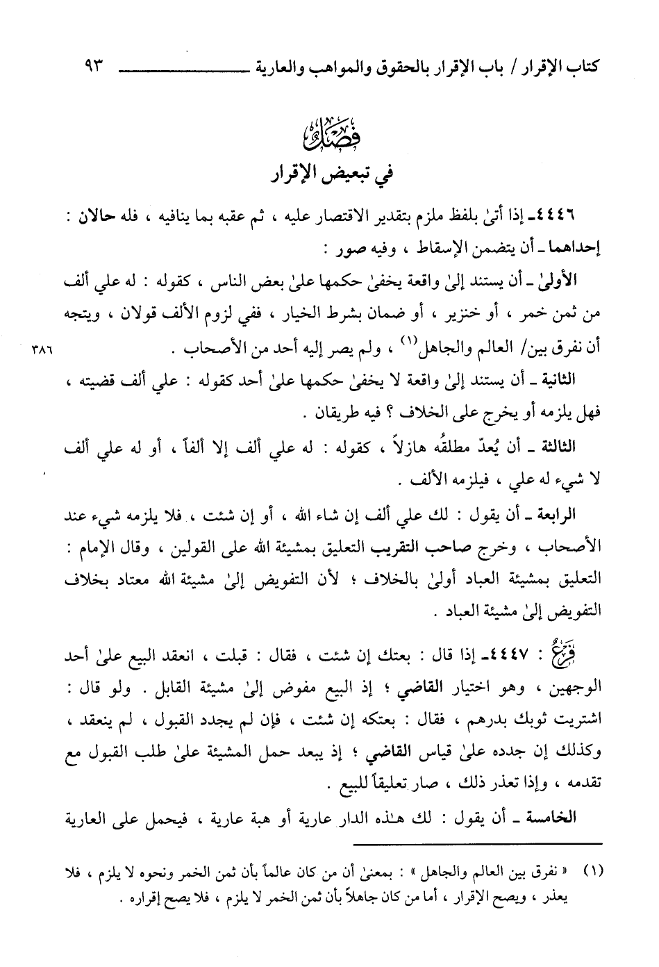 (1) "نفرق بين العالم والجاهل": بمعنى أن من كان عالماً بأن ثمن الخمر ونحوه لا يلزم، فلا يعذر، ويصح الإقرار، أما من كان جاهلاً بأن ثمن الخمر لا يلزم، فلا يصح إقراره.