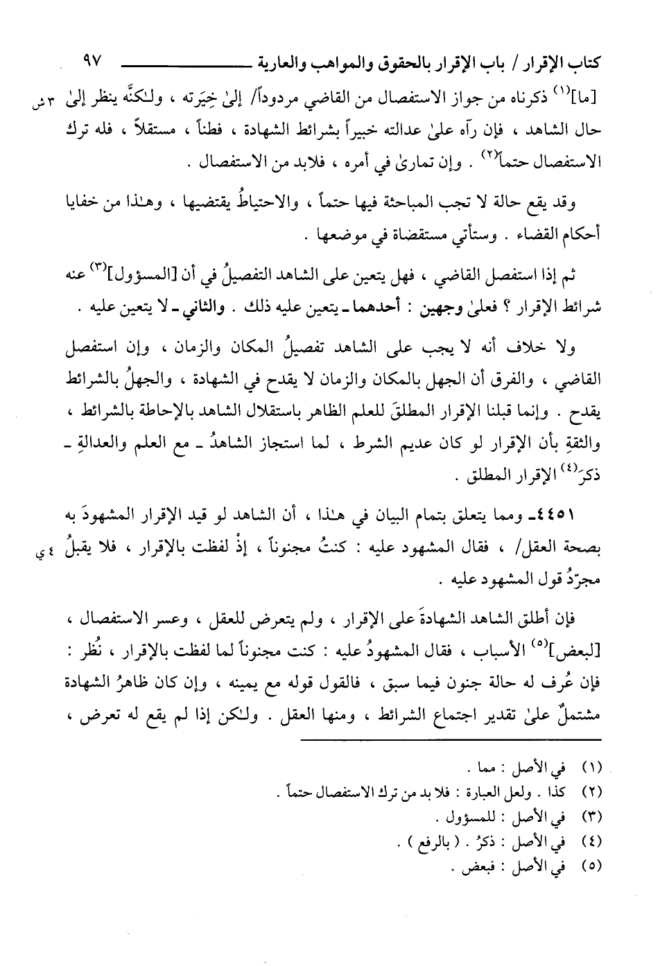 4451 - ومما يتعلق بتمام البيان في هذا، أن الشاهد لو قيد الإقرار المشهودَ به بصحة العقل، فقال المشهود عليه: كنتُ مجنوناً، إذْ لفظت بالإقرار، فلا يقبلُ مجرّدُ قول المشهود عليه.