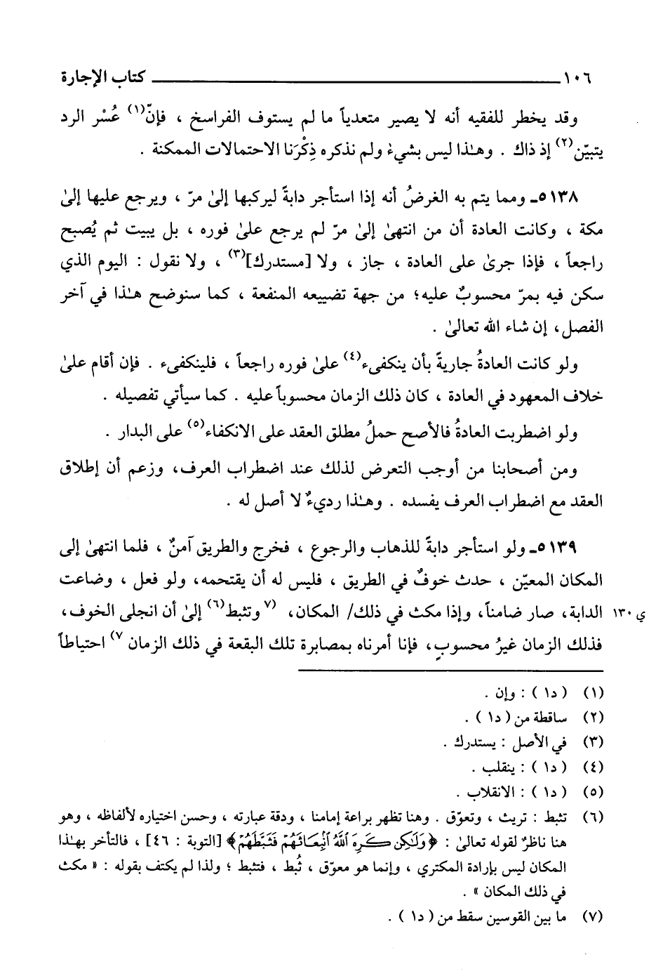 (6) تثبط: تريث، وتعوّق. وهنا تظهر براعة إمامنا، ودقة عبارته، وحسن اختياره لألفاظه، وهو هنا ناظرٌ لقوله تعالى: {وَلَكِنْ كَرِهَ اللَّهُ انْبِعَاثَهُمْ فَثَبَّطَهُمْ} [التوبة: 46]، فالتأخر بهذا المكان ليس برادة المكتري، وإنما هو معوّق، ثُبط، فتثبط، ولذا لم يكتف بقوله: " مكث في ذلك المكان ".