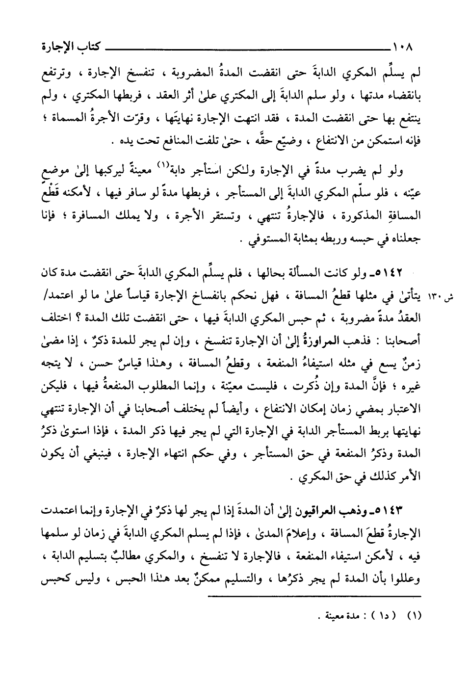5143 - وذهب العراقيون إلى أن المدةَ إذا لم يجر لها ذكرٌ في الإجارة وإنما اعتمدت الإجارةُ قطعَ المسافة، وإعلامَ المدى، فإذا لم يسلم المكري الدابةَ في زمان لو سلمها فيه، لأمكن استيفاء المنفعة، فالإجارة لا تنفسخ، والمكري مطالبٌ بتسليم الدابة، وعللوا بأن المدة لم يجر ذكرُها، والتسليم ممكنٌ بعد هذا الحبس، وليس كحبس