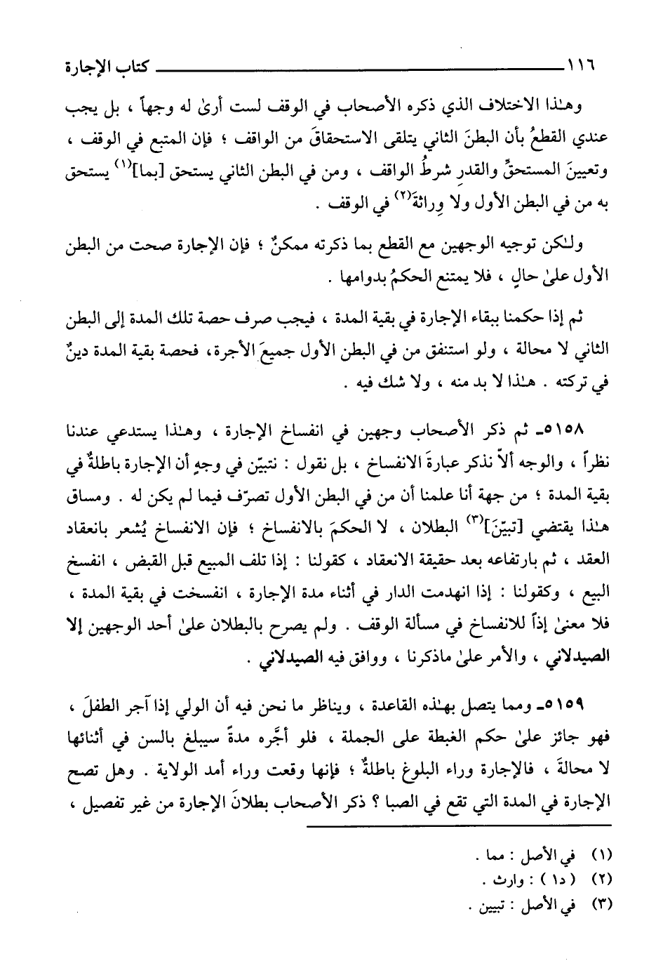 5158 - ثم ذكر الأصحاب وجهين في انفساخ الإجارة، وهذا يستدعي عندنا نظراً، والوجه ألاّ نذكر عبارةَ الانفساخ، بل نقول: نتبيّن في وجهٍ أن الإجارة باطلةٌ في بقية المدة؛ من جهة أنا علمنا أن من في البطن الأول تصرّف فيما لم يكن له. ومساق هذا يقتضي [تبيّنَ] (3) البطلان، لا الحكمَ بالانفساخ؛ فإن الانفساخ يُشعر بانعقاد العقد، ثم بارتفاعه بعد حقيقة الانعقاد، كقولنا: إذا تلف المبيع قبل القبض، انفسخ البيع، وكقولنا: إذا انهدمت الدار في أثناء مدة الإجارة، انفسخت في بقية المدة، فلا معنى إذاً للانفساخ في مسألة الوقف. ولم يصرح بالبطلان على أحد الوجهين إلا الصيدلاني، والأمر على ما ذكرنا، ووافق فيه الصيدلاني.