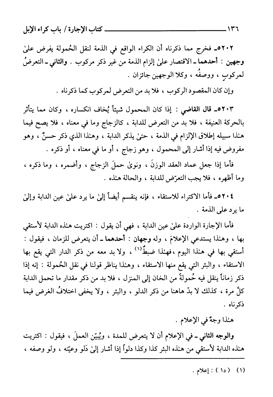 5202 - فخرج مما ذكرناه أن الكراء الواقع في الذمة لنقل الحُمولة يفرض على وجهين: أحدهما - الاقتصار على إلزام الذمة من غير ذكر مركوب. والثاني - التعرضُ لمركوبٍ، ووصفُه، وكلا الوجهين جائزان.