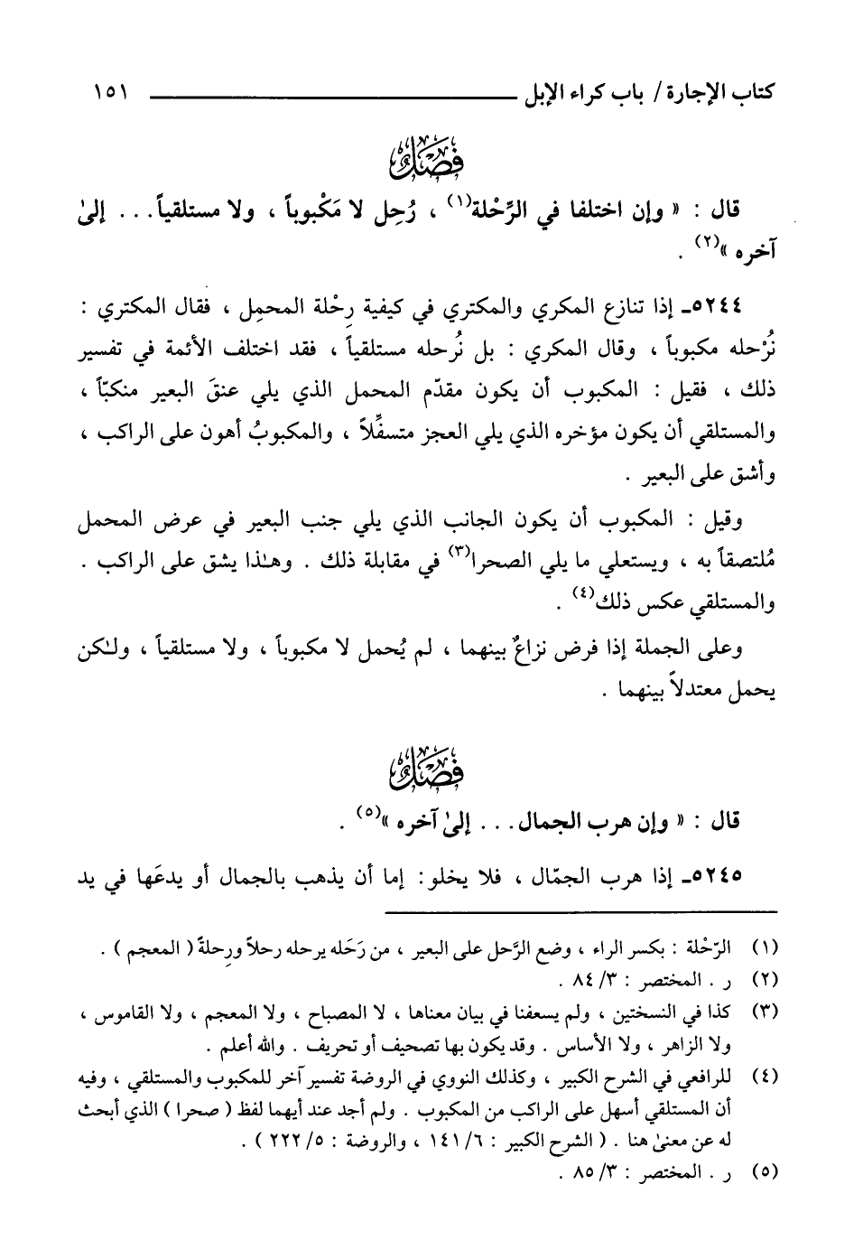 5244 - إذا تنازع المكري والمكتري في كيفية رِحْلة المحمِل، فقال المكتري: نُرْحله مكبوباً، وقال المكري: بل نُرحله مستلقياً، فقد اختلف الأئمة في تفسير ذلك، فقيل: المكبوب أن يكون مقدّم المحمل الذي يلي عنقَ البعير منكبّاً، والمستلقي أن يكون مؤخره الذي يلي العجز متسفِّلاً، والمكبوبُ أهون على الراكب، وأشق على البعير.