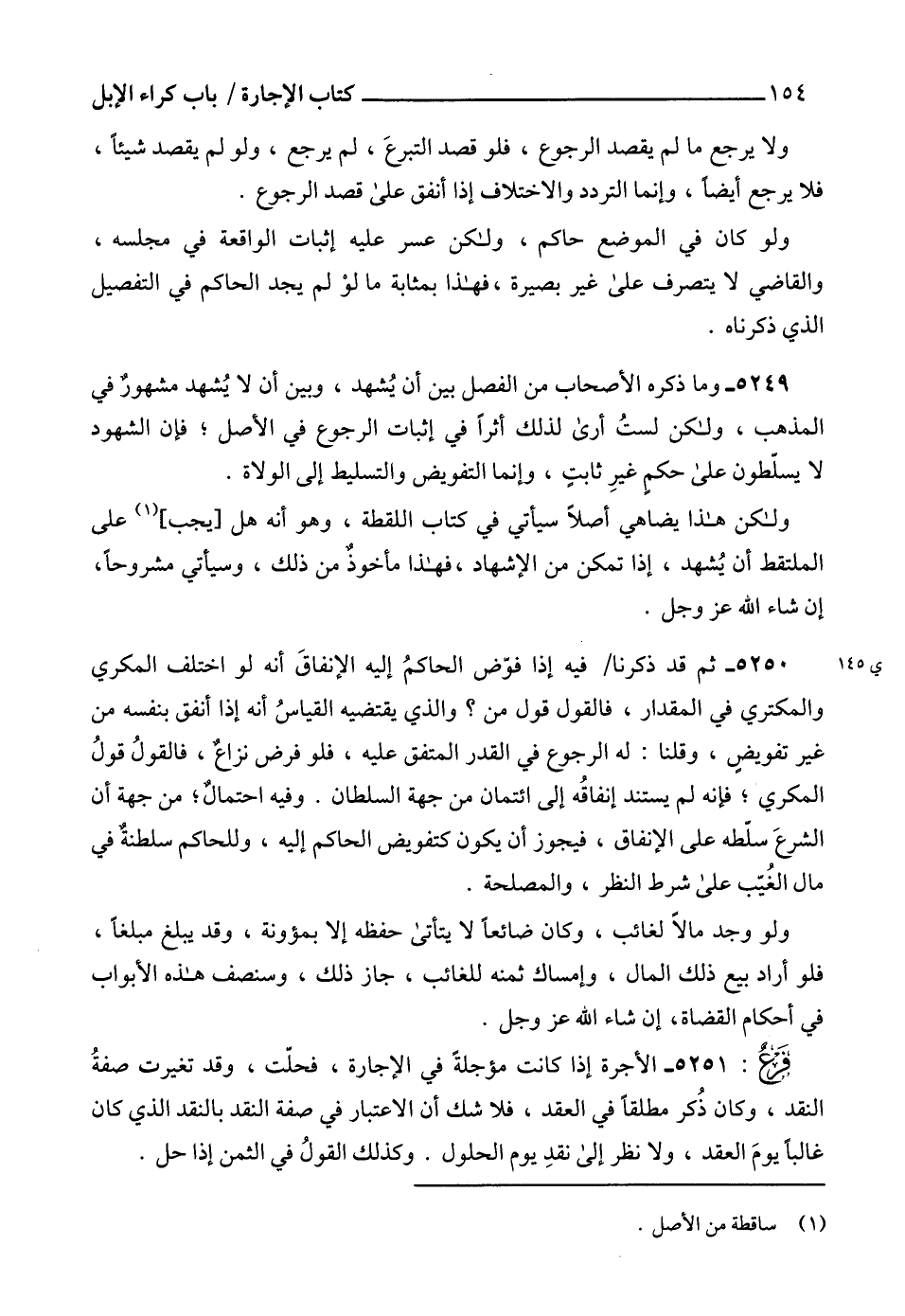 5249 - وما ذكره الأصحاب من الفصل بين أن يُشهد، وبين أن لا يُشهد مشهورٌ في المذهب، ولكن لستُ أرى لذلك أثراً في إثبات الرجوع في الأصل؛ فإن الشهود لا يسقطون على حكمٍ غيرِ ثابتٍ، وإنما التفويض والتسليط إلى الولاة.