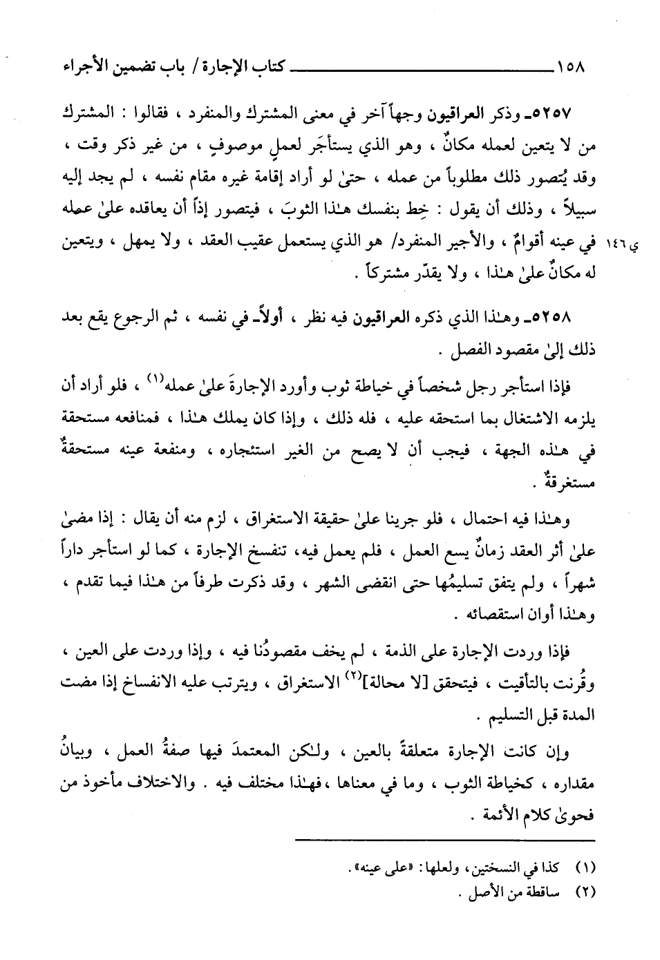 5257 - وذكر العراقيون وجهاً آخر في معنى المشترك والمنفرد، فقالوا: المشترك من لا يتعين لعمله مكانٌ، وهو الذي يستأجَر لعملٍ موصوفٍ، من غير ذكر وقت، وقد يُتصور ذلك مطلوباً من عمله، حتى لو أراد إقامة غيره مقام نفسه، لم يجد إليه سبيلاً، وذلك أن يقول: خِط بنفسك هذا الثوبَ، فيتصور إذاً أن يعاقده على عمله في عينه أقوامٌ، والأجير المنفرد هو الذي يستعمل عقيب العقد، ولا يمهل، ويتعين له مكانٌ على هذا، ولا يقدّر مشتركاً.