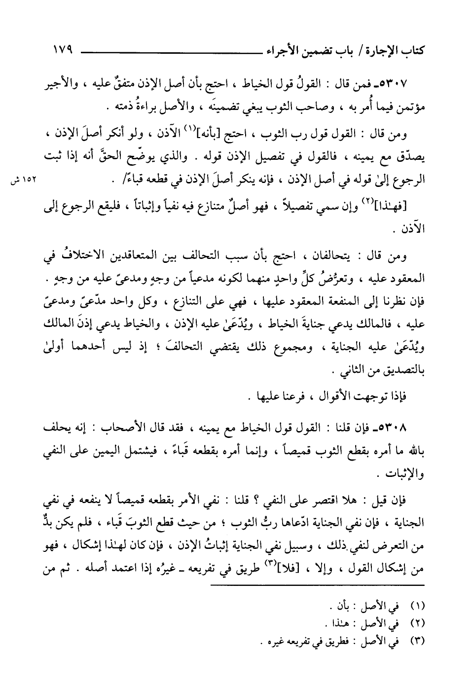 5307 - فمن قال: القولُ قول الخياط، احتج بأن أصل الإذن متفقٌ عليه، والأجير مؤتمن فيما أُمر به، وصاحب الثوب يبغي تضمينَه، والأصل براءةُ ذمته.