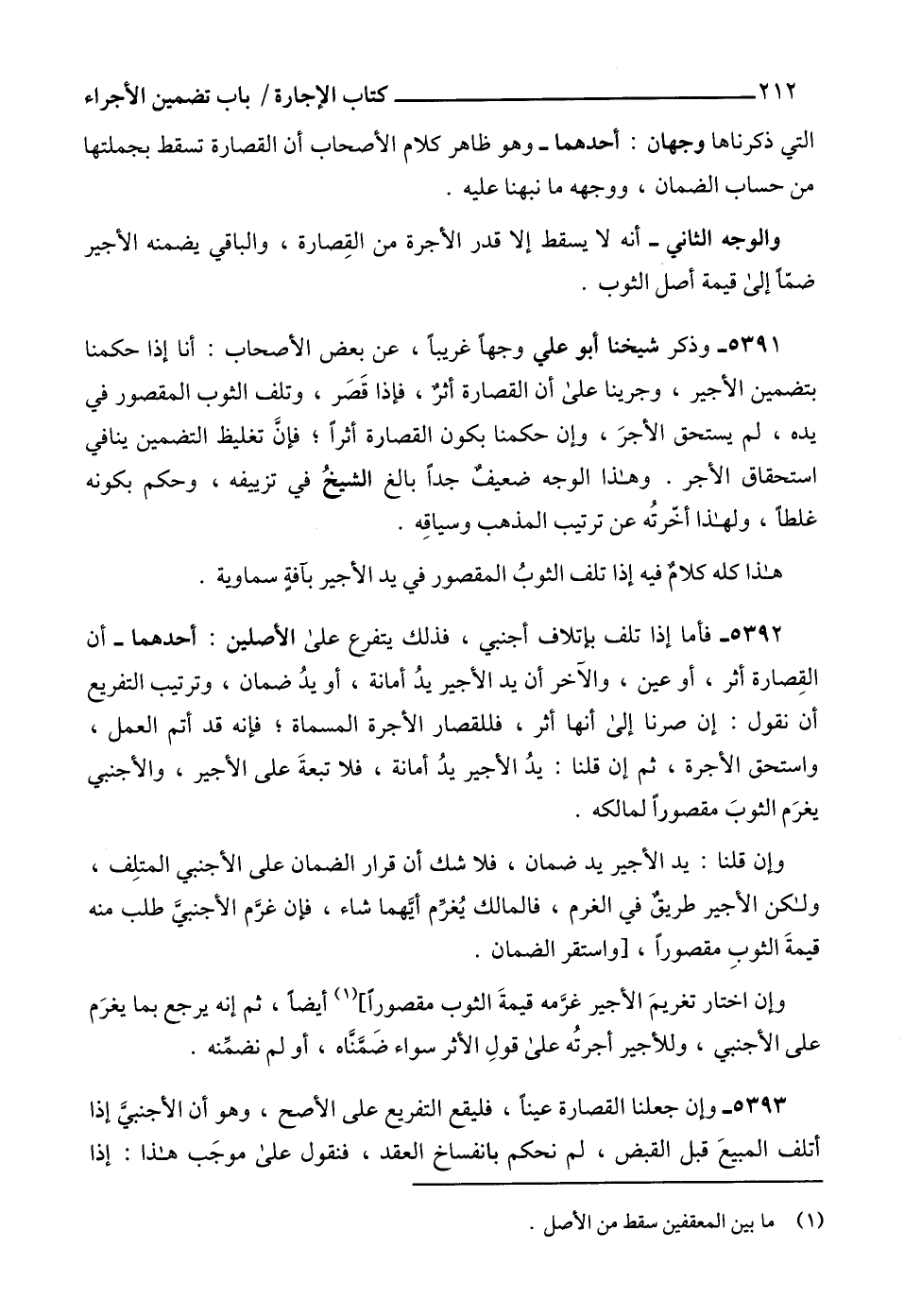 5391 - وذكر شيخنا أبو علي وجهاً غريباً، عن بعض الأصحاب: أنا إذا حكمنا بتضمين الأجير، وجرينا على أن القصارة أثرٌ، فإذا قَصَر، وتلف الثوب المقصور في يده، لم يستحق الأجرَ، وإن حكمنا بكون القصارة أثراً؛ فإنَّ تغليظ التضمين ينافي استحقاق الأجر. وهذا الوجه ضعيفٌ جداً بالغ الشيخُ في تزييفه، وحكم بكونه غلطاً، ولهذا أخّرتُه عن ترتيب المذهب وسياقِه.