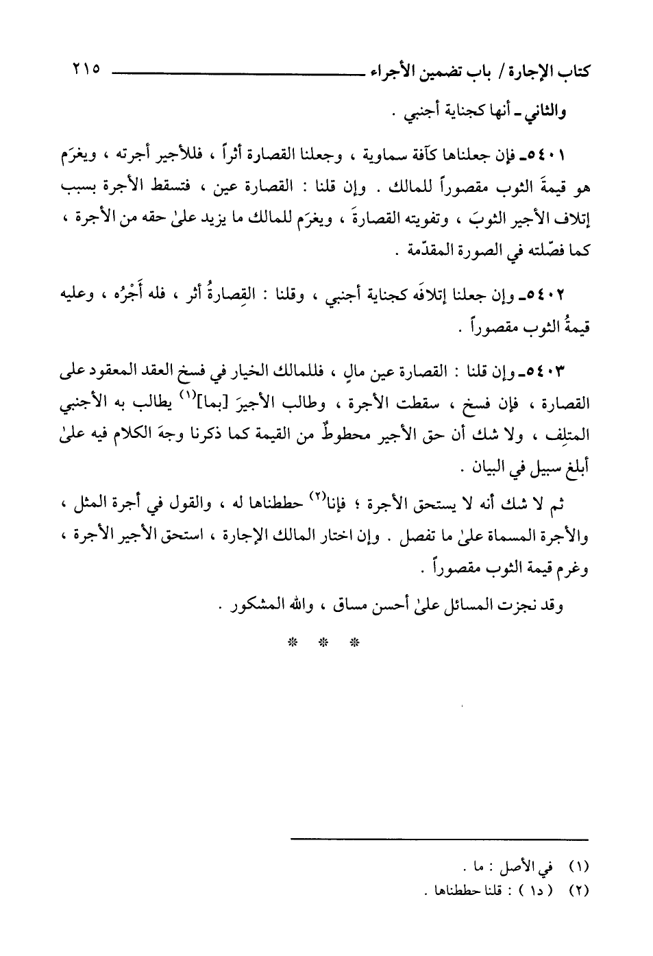 5402 - وإن جعلنا إتلافَه كجناية أجنبي، وقلنا: القِصارةُ أثر، فله أَجْرُه، وعليه قيمةُ الثوب مقصوراً.