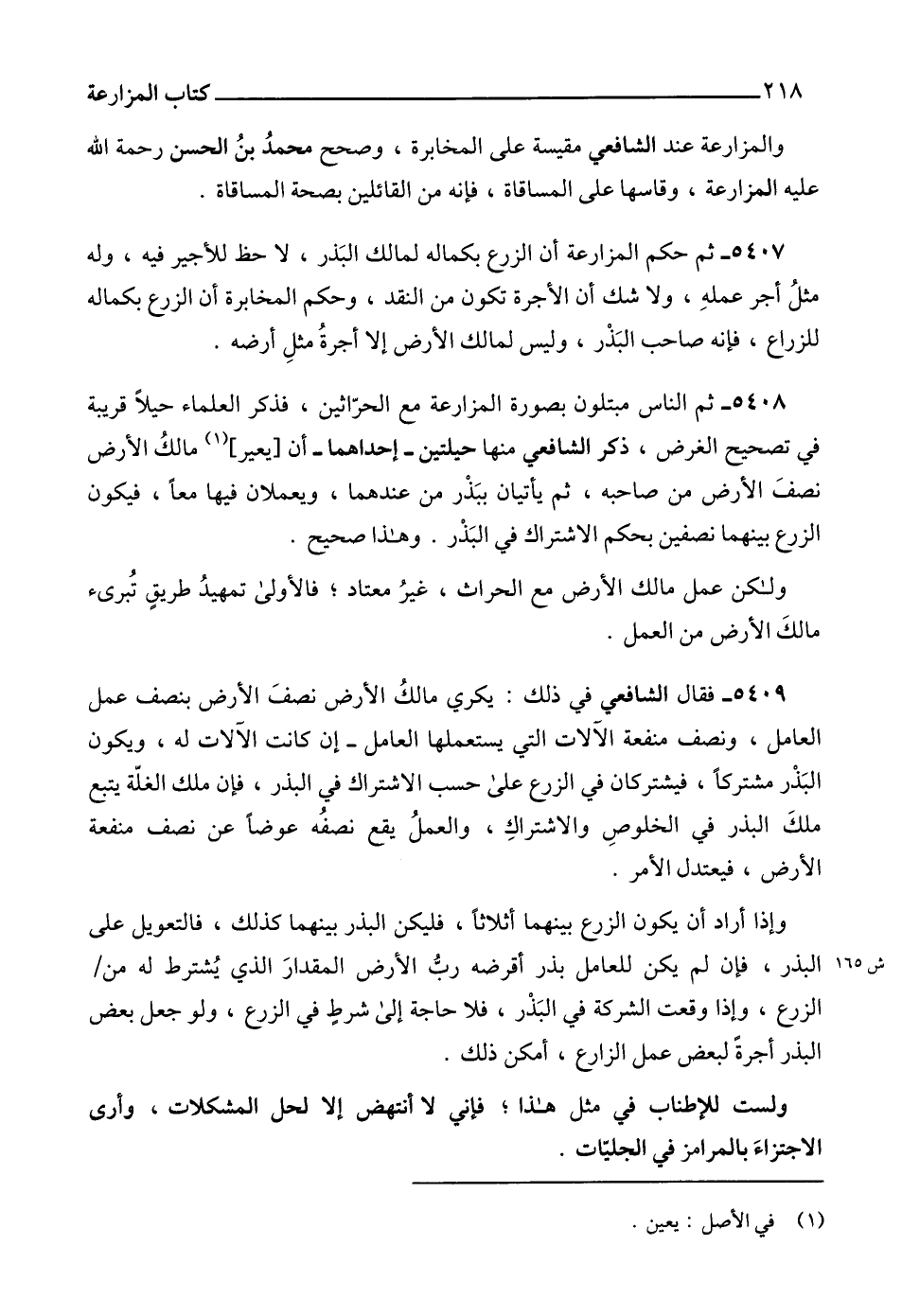 5409 - فقال الشافعي في ذلك: يكري مالكُ الأرض نصفَ الأرض بنصف عمل العامل، ونصف منفعة الآلات التي يستعملها العامل- إن كانت الآلات له، ويكون البَذْر مشتركاًً، فيشتركان في الزرع على حسب الاشتراك في البذر، فإن ملك الغلّة يتبع ملكَ البذر في الخلوصِ والاشتراكِ، والعملُ يقع نصفُه عوضاًً عن نصف منفعة الأرض، فيعتدل الأمر.