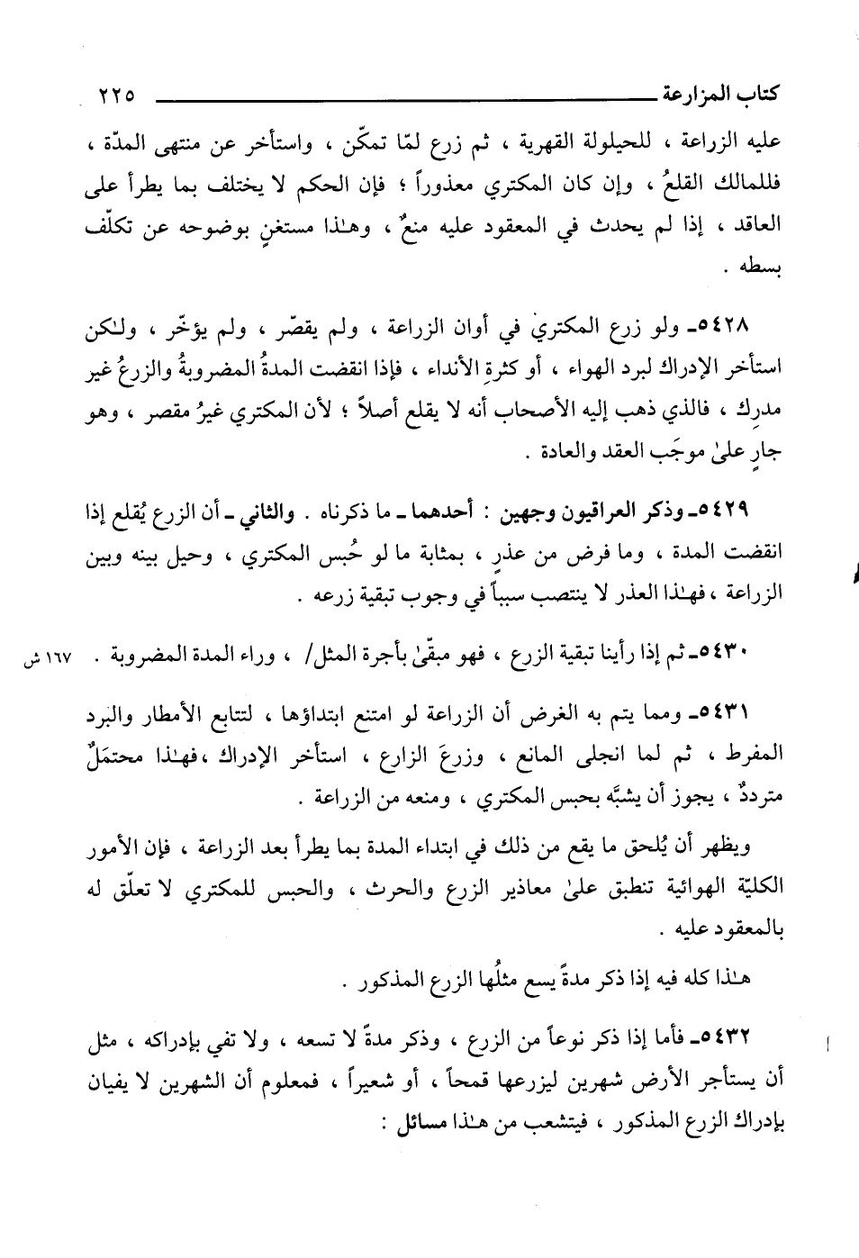 5428 - ولو زرع المكتري في أوان الزراعة، ولم يقصّر، ولم يؤخّر، ولكن استأخر الإدراك لبرد الهواء، أو كثرةِ الأنداء، فإذا انقضت المدةُ المضروبةُ والزرعُ غير مدرِك، فالذي ذهب إليه الأصحاب أنه لا يقلع أصلاً؛ لأن المكتري غيرُ مقصر، وهو جارٍ على موجَب العقد والعادة.