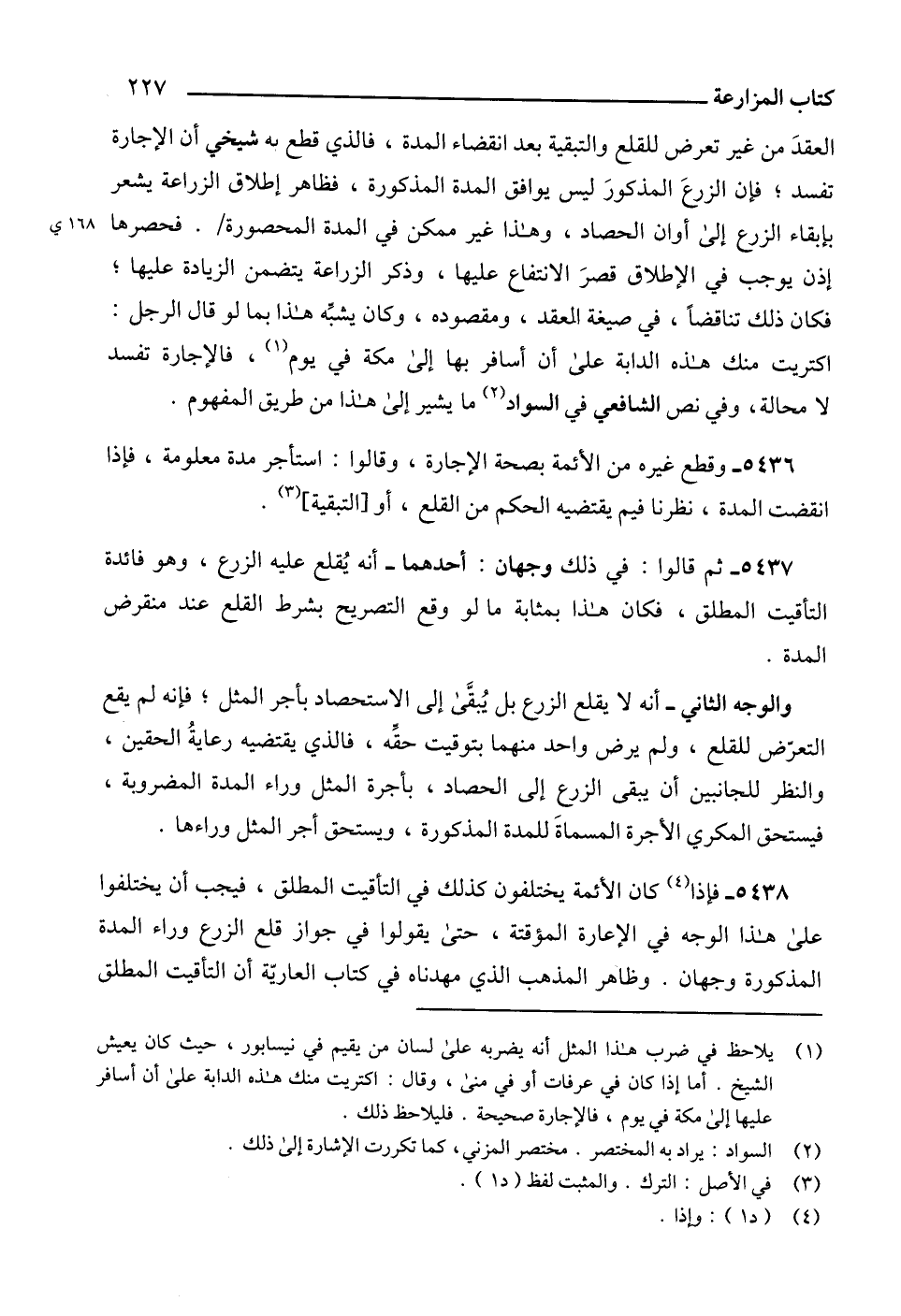 5438 - فإذا (4) كان الأئمة يختلفون كذلك في التأقيت المطلق، فيجب أن يختلفوا على هذا الوجه في الإعارة المؤقتة، حتى يقولوا في جواز قلع الزرع وراء المدة المذكورة وجهان. وظاهر المذهب الذي مهدناه في كتاب العاريّة أن التأقيت المطلق