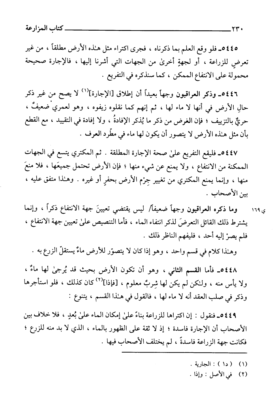 5449 - فنقول: إن اكتراها للزراعة بناءً على إمكان الماء على بُعدٍ، فلا خلاف بين الأصحاب أن الإجارة فاسدة؛ إذ لا ثقة على الظهور بالماء، الذي لا بد منه للزرع؛ فكانت جهة الزراعة فاسدةً، لم يختلف الأصحاب فيها.
