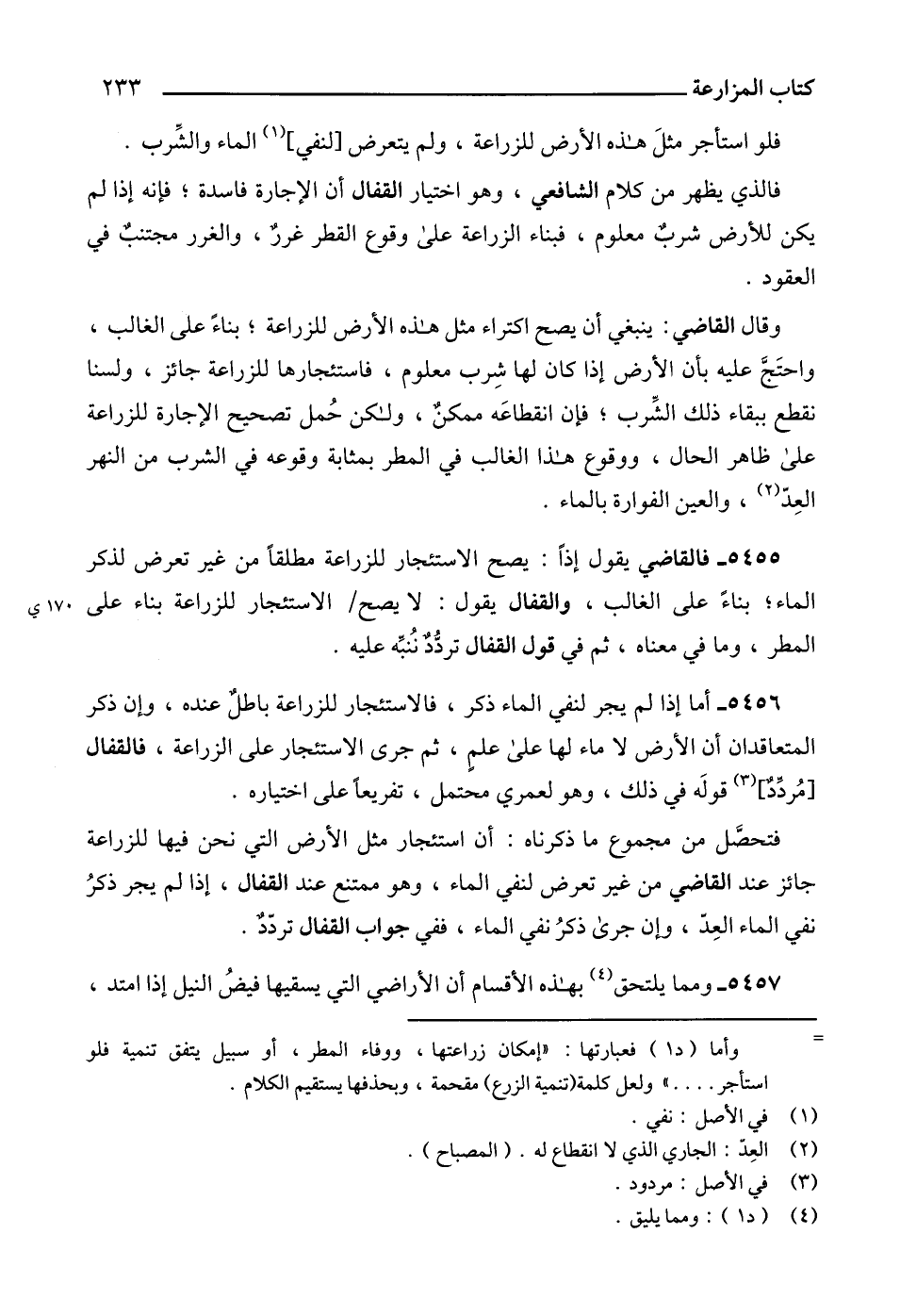=وأما (د 1) فعبارتها: "إمكان زراعتها، ووفاء المطر، أو سبيل يتفق تنمية فلو استأجر .... " ولعل كلمة (تنمية الزرع) مقحمة، وبحذفها يستقيم الكلام.