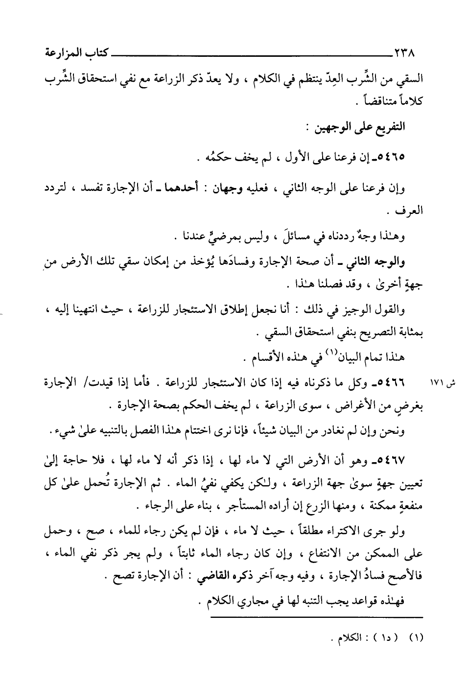 5467 - وهو أن الأرض التي لا ماء لها، إذا ذكر أنه لا ماء لها، فلا حاجة إلى تعيين جهةٍ سوى جهة الزراعة، ولكن يكفي نفيُ الماء. ثم الإجارة تُحمل على كل منفعةٍ ممكنة، ومنها الزرع إن أراده المستأجر، بناء على الرجاء.