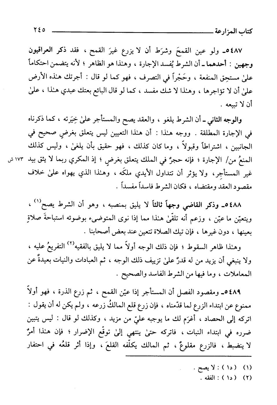 5487 - ولو عين القمحَ وشرَط أن لا يزرع غيرَ القمح، فقد ذكر العراقيون وجهين: أحدهما - أن الشرط يُفسد الإجارة، وهذا هو الظاهر؛ لأنه يتضمن احتكاماً على مستحِق المنفعة، وحَجْراً في التصرف، فهو كما لو قال: أجرتك هذه الأرض على أن لا تؤاجرها، وهذا لا شك مفسد، كما لو قال البائع بعتك عبدي هذا، على أن لا تبيعه.