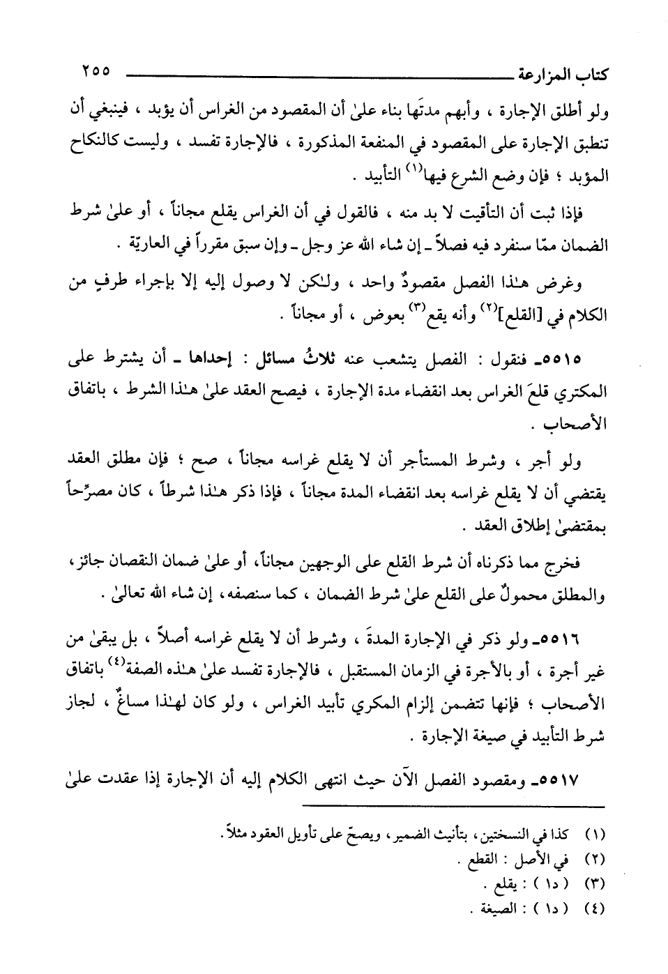 5515 - فنقول: الفصل يتشعب عنه ثلاثُ مسائل: إحداها - أن يشترط على المكتري قلعَ الغراس بعد انقضاء مدة الإجارة، فيصح العقد على هذا الشرط، باتفاق الأصحاب.