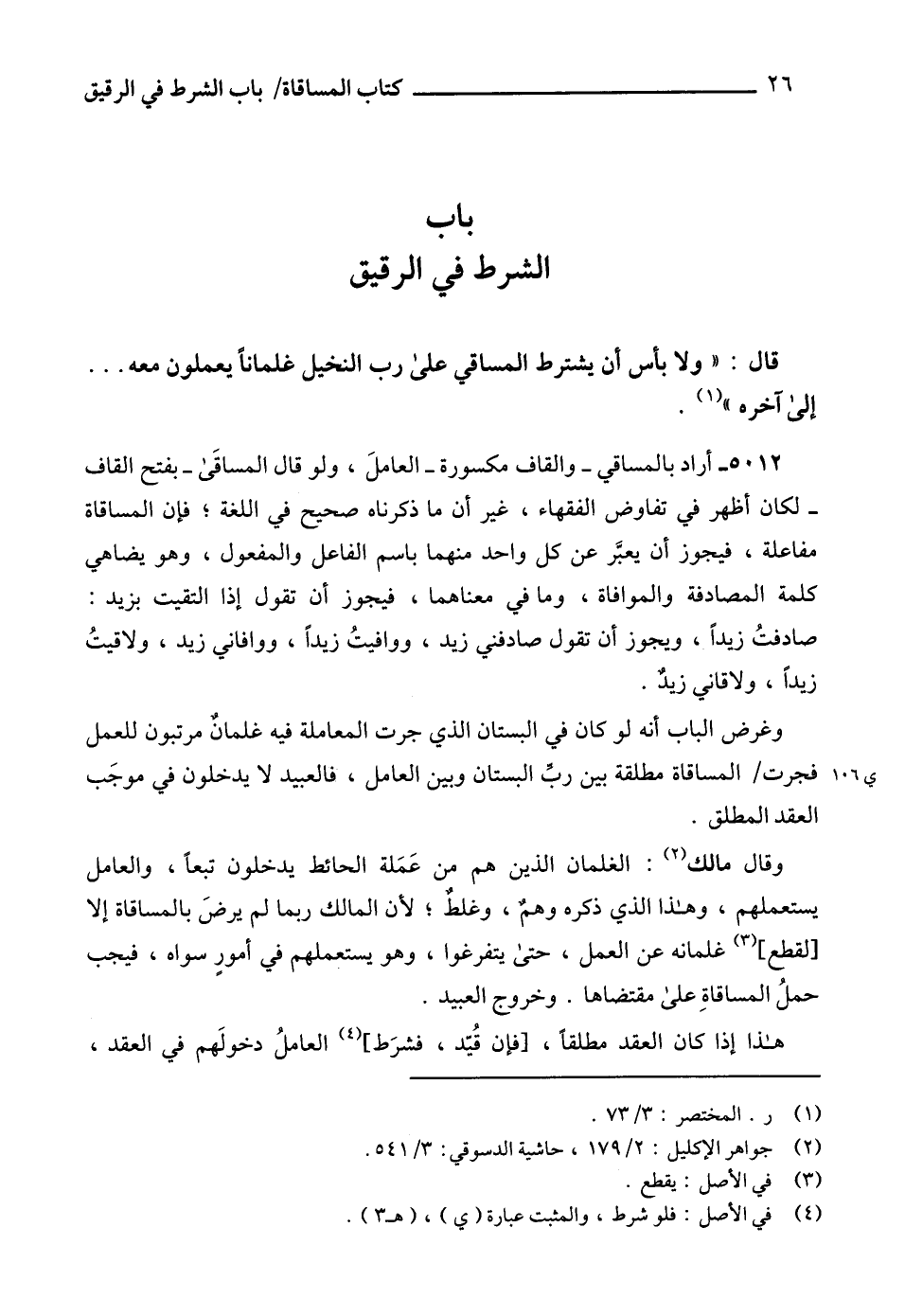 5012 - أراد بالمساقي -والقاف مكسورة- العاملَ، ولو قال المساقَى- بفتح القاف - لكان أظهر في تفاوض الفقهاء، غير أن ما ذكرناه صحيح في اللغة؛ فإن المساقاة مفاعلة، فيجوز أن يعبَّر عن كل واحد منهما باسم الفاعل والمفعول، وهو يضاهي كلمة المصادفة والموافاة، وما في معناهما، فيجوز أن تقول إذا التقيت بزيد: صادفتُ زيداً، ويجوز أن تقول صادفني زيد، ووافيتُ زيداً، ووافاني زيد، ولاقيتُ زيداً، ولاقاني زيدٌ.