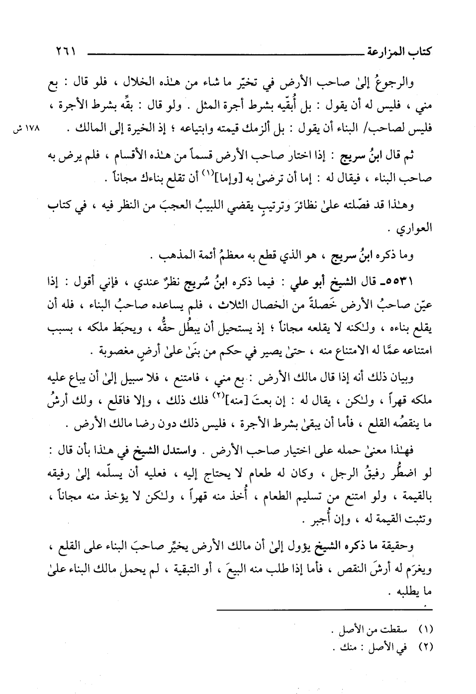 5531 - قال الشيخ أبو علي: فيما ذكره ابنُ سُريج نظرٌ عندي، فإني أقول: إذا عيّن صاحبُ الأرض خَصلةً من الخصال الثلاث، فلم يساعده صاحبُ البناء، فله أن يقلع بناءه، ولكنه لا يقلعه مجاناً؛ إذ يستحيل أن يبطُل حقُّه، ويحبَط ملكه، بسبب امتناعه عمَّا له الامتناع منه، حتى يصير في حكم من بنَى على أرضٍ مغصوبة.