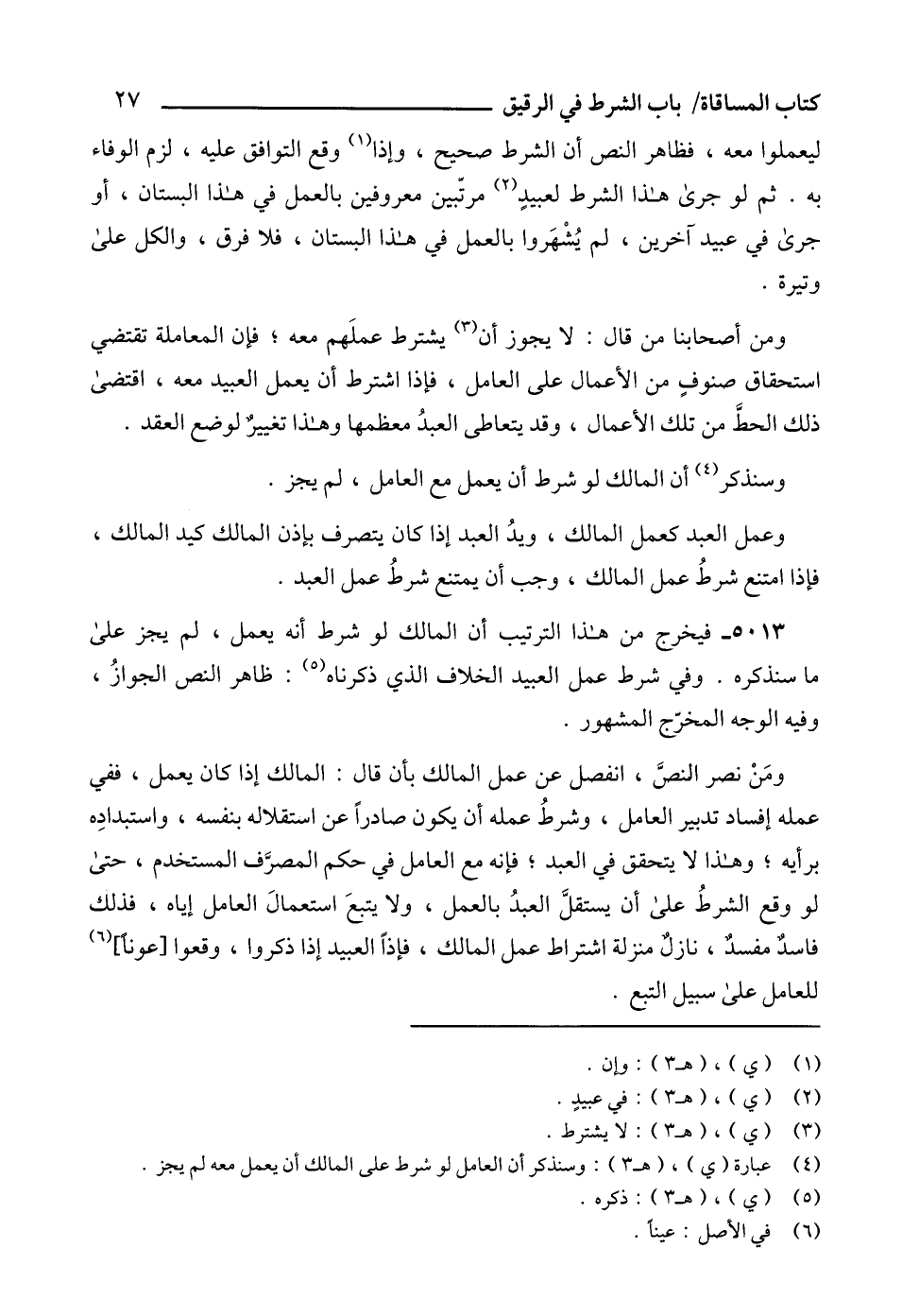 5013 - فيخرج من هذا الترتيب أن المالك لو شرط أنه يعمل، لم يجز على ما سنذكره. وفي شرط عمل العبيد الخلاف الذي ذكرناه (5): ظاهر النص الجوازُ، وفيه الوجه المخرّج المشهور.