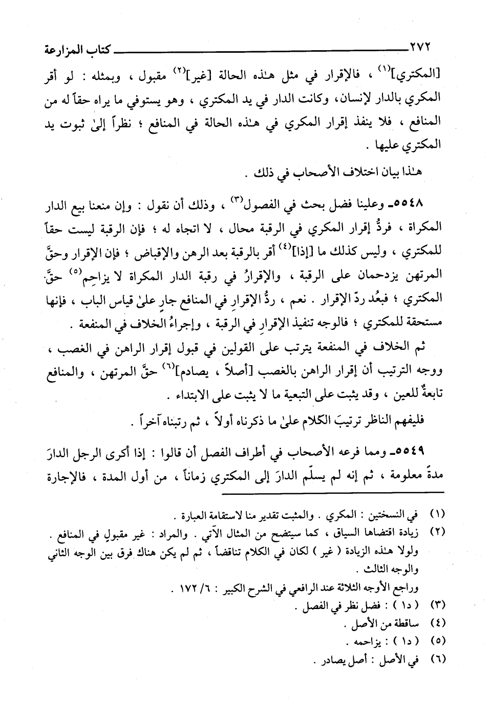 5548 - وعلينا فضل بحث في الفصول (3)، وذلك أن نقول: وإن منعنا بيع الدار المكراة، فردُّ إقرار المكري في الرقبة محال، لا اتجاه له؛ فإن الرقبة ليست حقاً للمكتري، وليس كذلك ما [إذا] (4) أقر بالرقبة بعد الرهن والإقباض؛ فإن الإقرار وحقَّ المرتهن يزدحمان على الرقبة، والإقرارُ في رقبة الدار المكراة لا يزاحِم (5) حقَّ المكتري؛ فبعُد ردّ الإقرار. نعم، ردُّ الإقرارِ في المنافع جارٍ على قياس الباب، فإنها مستحقة للمكتري؛ فالوجه تنفيد الأقرارِ في الرقبة، وإجراءُ الخلاف في المنفعة.
