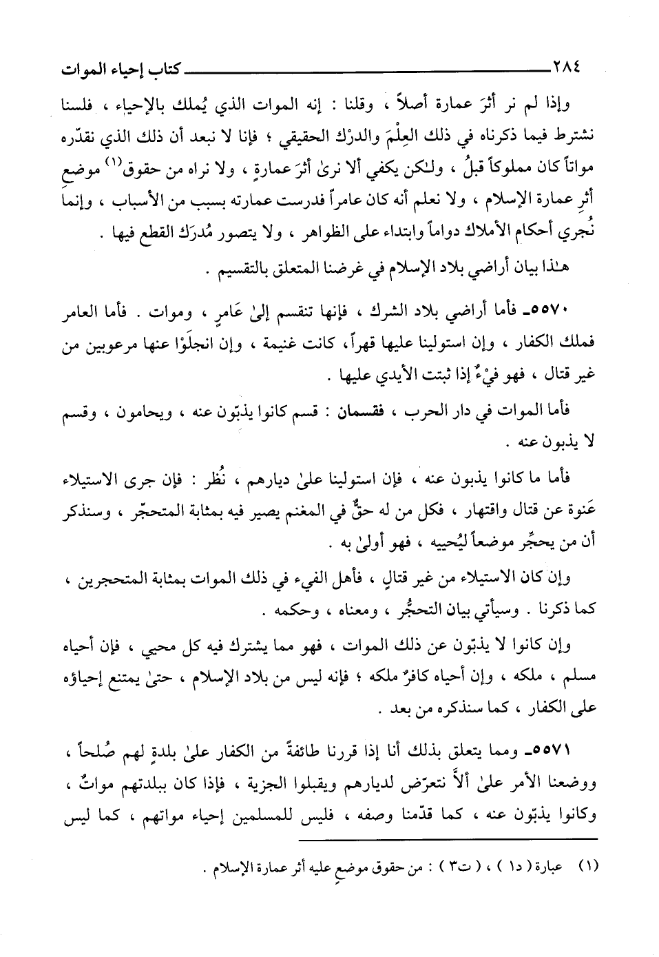 5571 - ومما يتعلق بذلك أنا إذا قررنا طائفةً من الكفار على بلدةٍ لهم صُلحاً، ووضعنا الأمر على ألاَّ نتعرّض لديارهم ويقبلوا الجزية، فإذا كان ببلدتهم مواتٌ، وكانوا يذبّون عنه، كما قدّمنا وصفه، فليس للمسلمين إحياء مواتهم، كما ليس