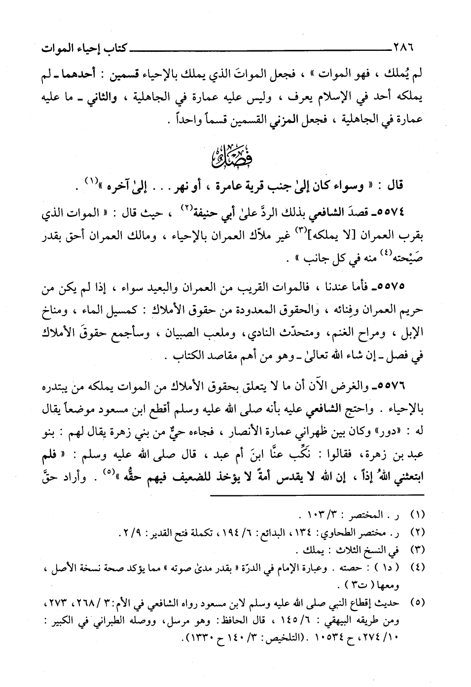 5574 - قصدَ الشافعي بذلك الردَّ على أبي حنيفة (2)، حيث قال: " الموات الذي بقرب العمران [لا يملكه] (3) غير ملاّك العمران بالإحياء، ومالك العمران أحق بقدر صَيْحته (4) منه في كل جانب ".
