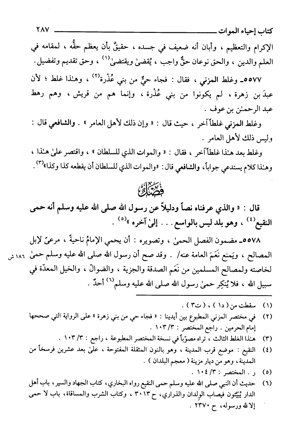 5578 - مضمون الفصل الحمى، وتصويره: أن يحمي الإمامُ ناحيةً، مرعىً لإبل المصالح، ويَمنع نَعَمَ العامة عنه. وقد صح أن رسول الله صلى الله عليه وسلم حمى لخاصته ولمصالح المسلمين من نَعَم الصدقة والجزية، والضوالّ، والخيل المعدّة في سبيل الله، فلا يُنكِر حمى رسول الله صلى الله عليه وسلم (6) أحدٌ.