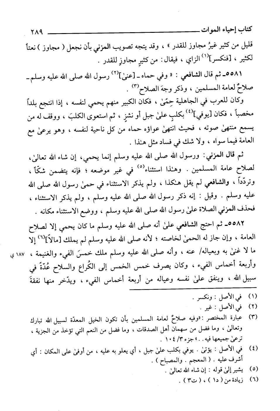 (3) عبارة المختصر: "وفيه صلاحٌ لعامة المسلمين بأن تكون الخيل المعدّة لسبيل الله تبارك وتعالى، وما فضل من سهمان أهل الصدقات، وما فضل من النعم التي تؤخد من الجزية، ترعى جميعها فيه .. " جزء 3/ 104.