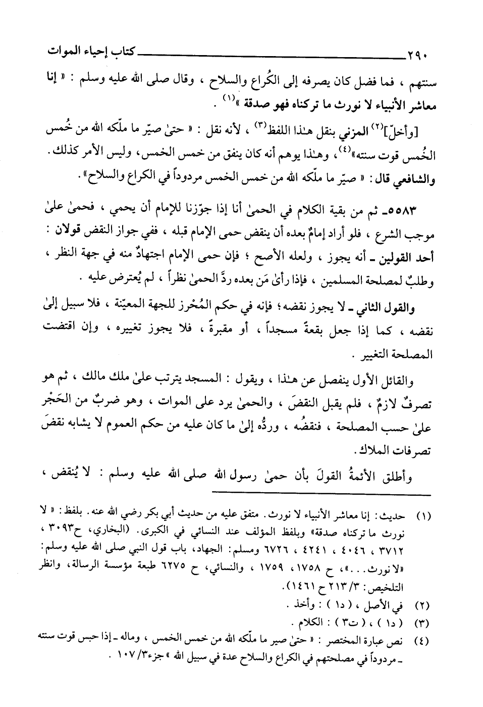 (4) نص عبارة المختصر: " حتى صير ما ملّكه الله من خمس الخمس، وماله -إذا حبس قوت سنته - مردوداً في مصلحتهم في الكراع والسلاح عدة في سبيل الله " جزء 3/ 107.