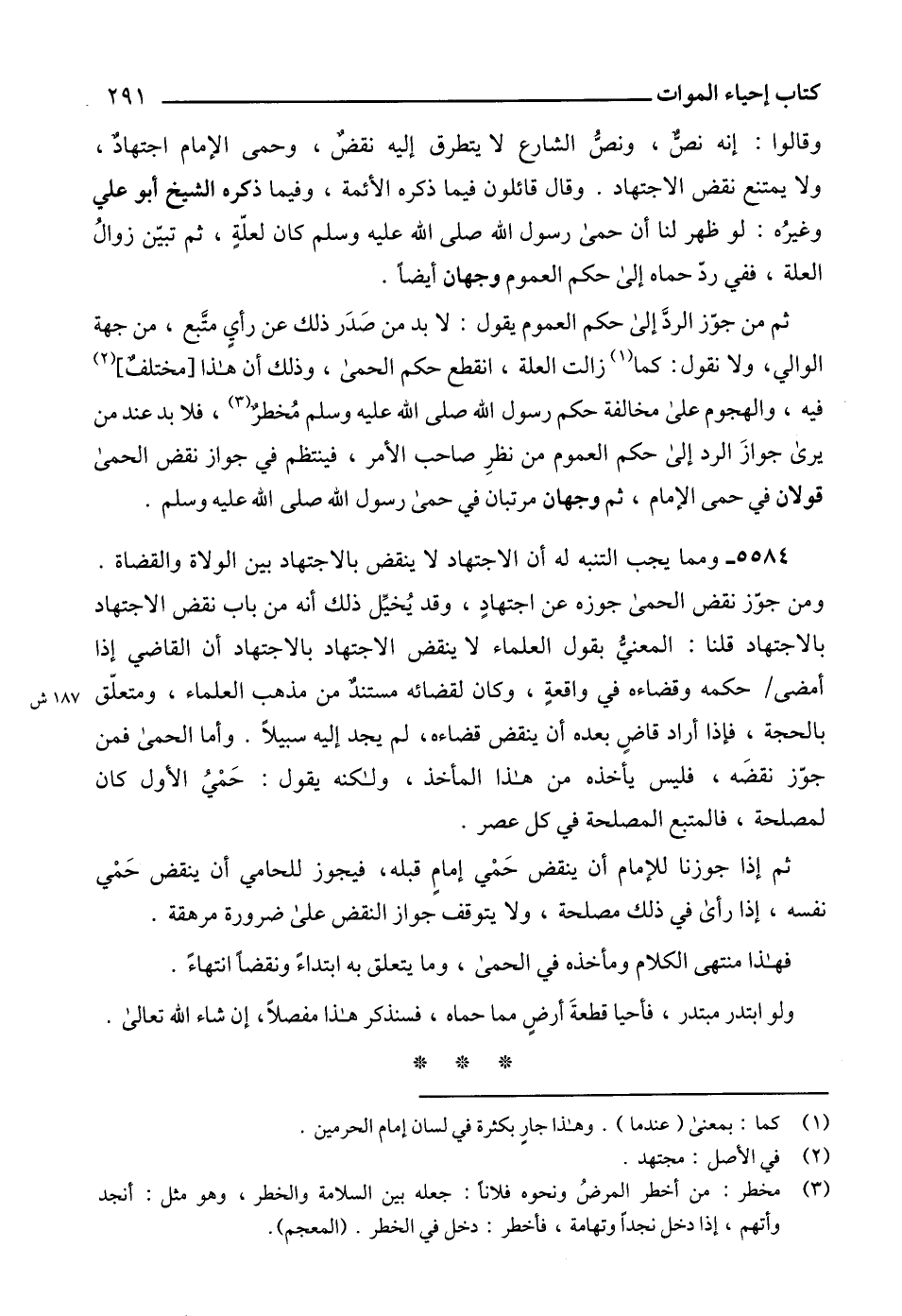 5584 - ومما يجب التنبه له أن الاجتهاد لا ينقض بالاجتهاد بين الولاة والقضاة ومن جوّز نقض الحمى جوزه عن اجتهادٍ، وقد يُخيِّل ذلك أنه من باب نقض الاجتهاد بالاجتهاد قلنا: المعنيُّ بقول العلماء لا ينقض الاجتهاد بالاجتهاد أن القاضي إذا أمضى حكمه وقضاءه في واقعةٍ، وكان لقضائه مستندٌ من مذهب العلماء، ومتعلّق بالحجة، فإذا أراد قاضٍ بعده أن ينقض قضاءه، لم يجد إليه سبيلاً. وأما الحمى فمن جوّز نقضَه، فليس يأخذه من هذا المأخذ، ولكنه يقول: حَمْيُ الأول كان لمصلحة، فالمتبع المصلحة في كل عصر.