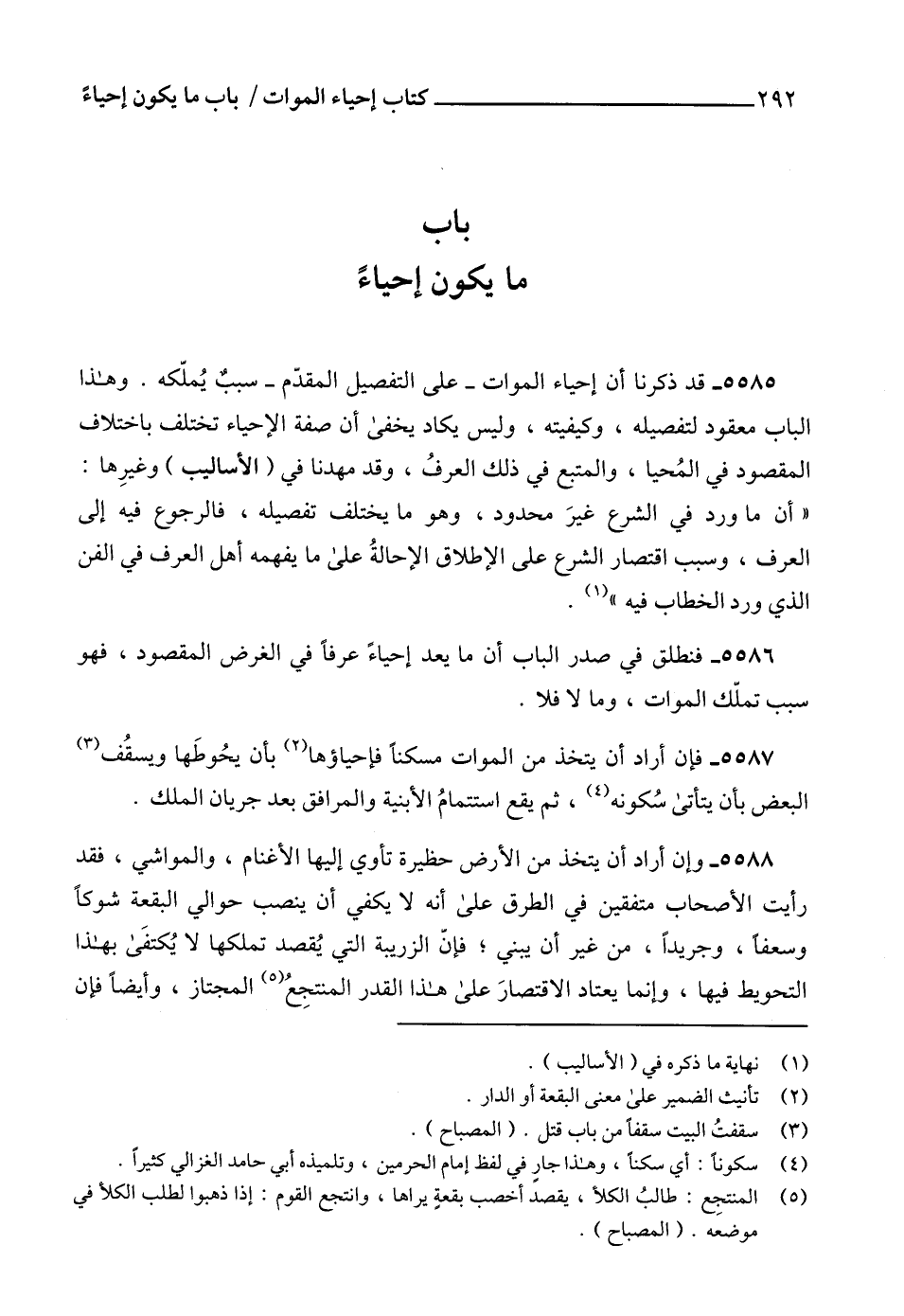 5586 - فنطلق في صدر الباب أن ما يعد إحياءً عرفاً في الغرض المقصود، فهو سبب تملّك الموات، وما لا فلا.