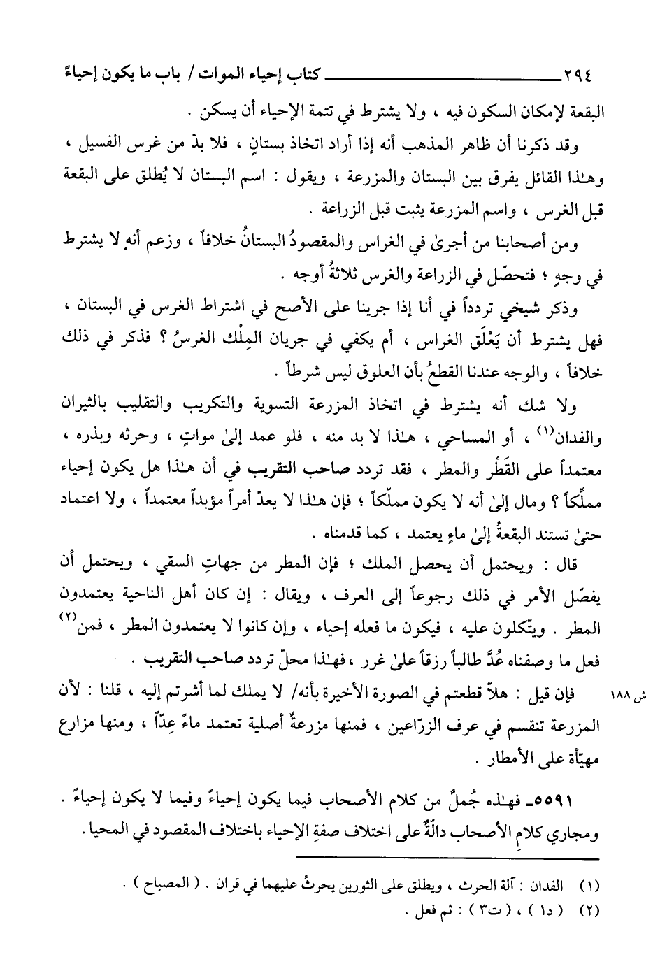 ولا شك أنه يشترط فى اتخاد المزرعة التسوية والتكريب والتقليب بالثيران والفدان (1)، أو المساحي، هذا لا بد منه، فلو عمد إلى مواتٍ، وحرثه وبذره، معتمداً على القَطْر والمطر، فقد تردد صاحب التقريب في أن هذا هل يكون إحياء مملِّكاً؟ ومال إلى أنه لا يكون مملّكاً؛ فإن هذا لا يعدّ أمراً مؤبداً معتمداً، ولا اعتماد حتى تستند البقعةُ إلى ماءٍ يعتمد، كما قدمناه.