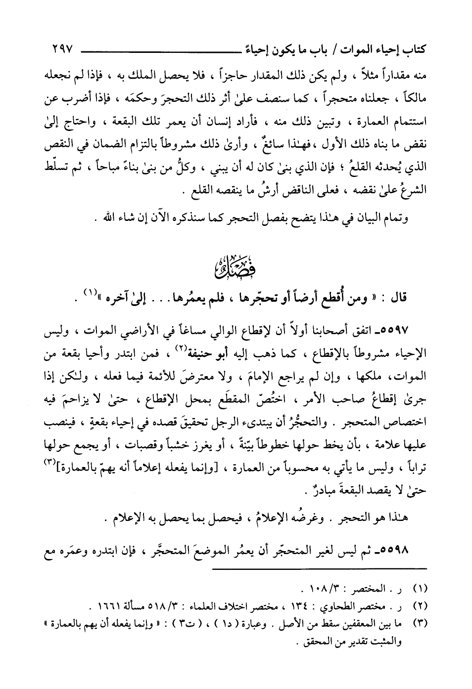 5597 - اتفق أصحابنا أولاً أن لإقطاع الوالي مساغاً في الأراضي الموات، وليس الإحياء مشروطاً بالإقطاع، كما ذهب إليه أبو حنيفة (2)، فمن ابتدر وأحيا بقعة من الموات، ملكها، وإن لم يراجع الإمامَ، ولا معترضَ للأئمة فيما فعله، ولكن إذا جرى إقطاعُ صاحب الأمر، اختُصّ المقطَع بمحل الإقطاع، حتى لا يزاحمَ فيه اختصاص المتحجر. والتحجُّرُ أن يبتدىء الرجل تحقيقَ قصده في إحياء بقعةٍ، فينصب عليها علامة، بأن يخط حولها خطوطاً بيّنةً، أو يغرز خشباً وقصبات، أو يجمع حولها تراباً، وليس ما يأتي به محسوباً من العمارة، [وإنما يفعله إعلاماً أنه يهمّ بالعمارة] (3) حتى لا يقصد البقعةَ مبادرٌ.
